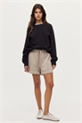Свободные шорты из легкого хлопкового свитшота с потертым видом. Эластичная резинка и завязки на талии, незаметные боковые карманы, открытые задние карманы и разрез на подоле.