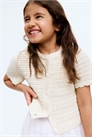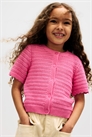 Кардиган из мягкого хлопка связан в технике пуантель, с круглым вырезом с ребристой отделкой, пуговицами спереди и короткими рукавами с манжетами с ребристой отделкой и гребешками. Окантовка по подолу.