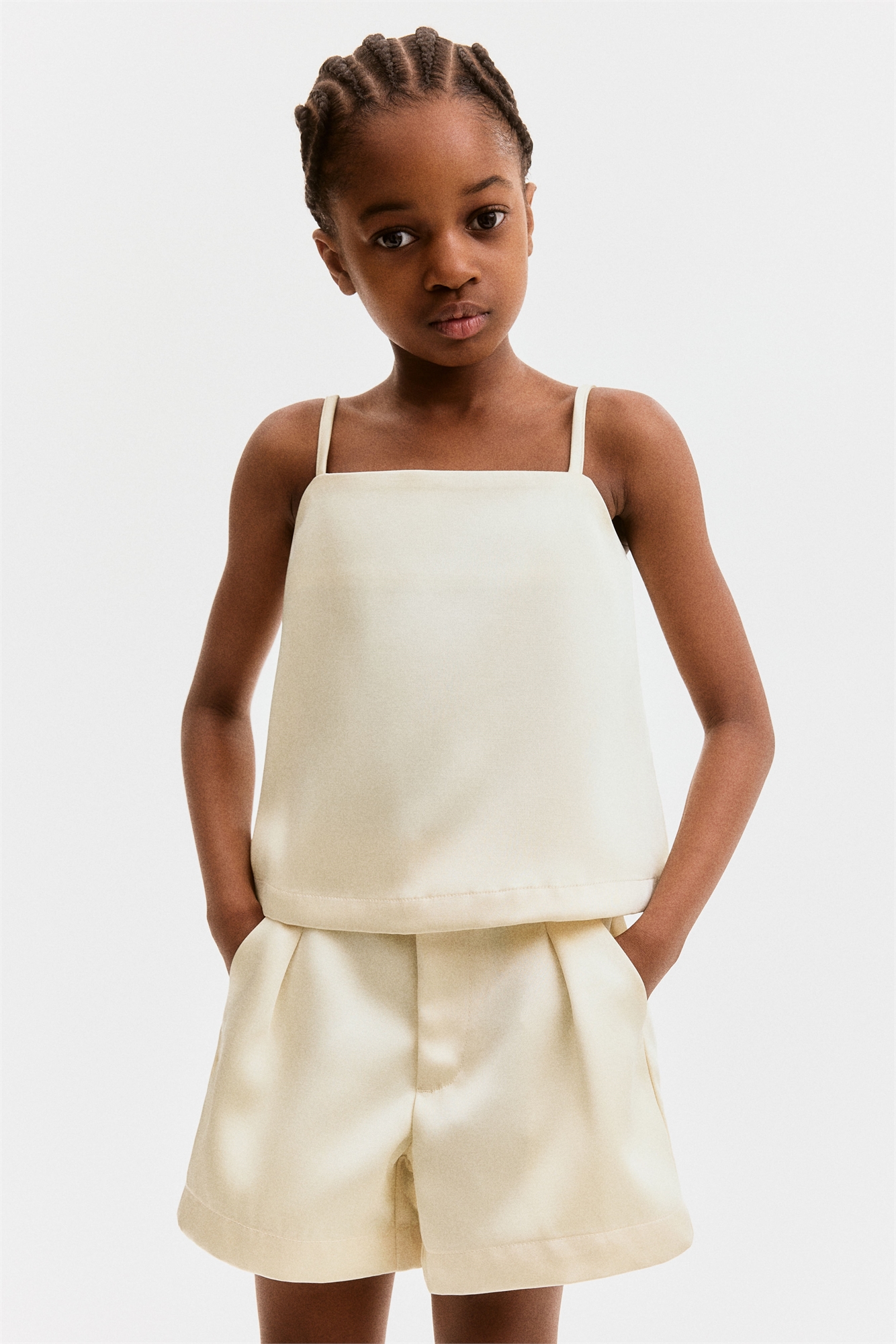 Комплект из топа на бретелях и шорт с переливающимся плетением. Топ с квадратным вырезом и пуговицами сзади. Шорты с регулируемой эластичной талией, застежкой на молнию и пуговицу, диагональными карманами спереди и складками по ногам.