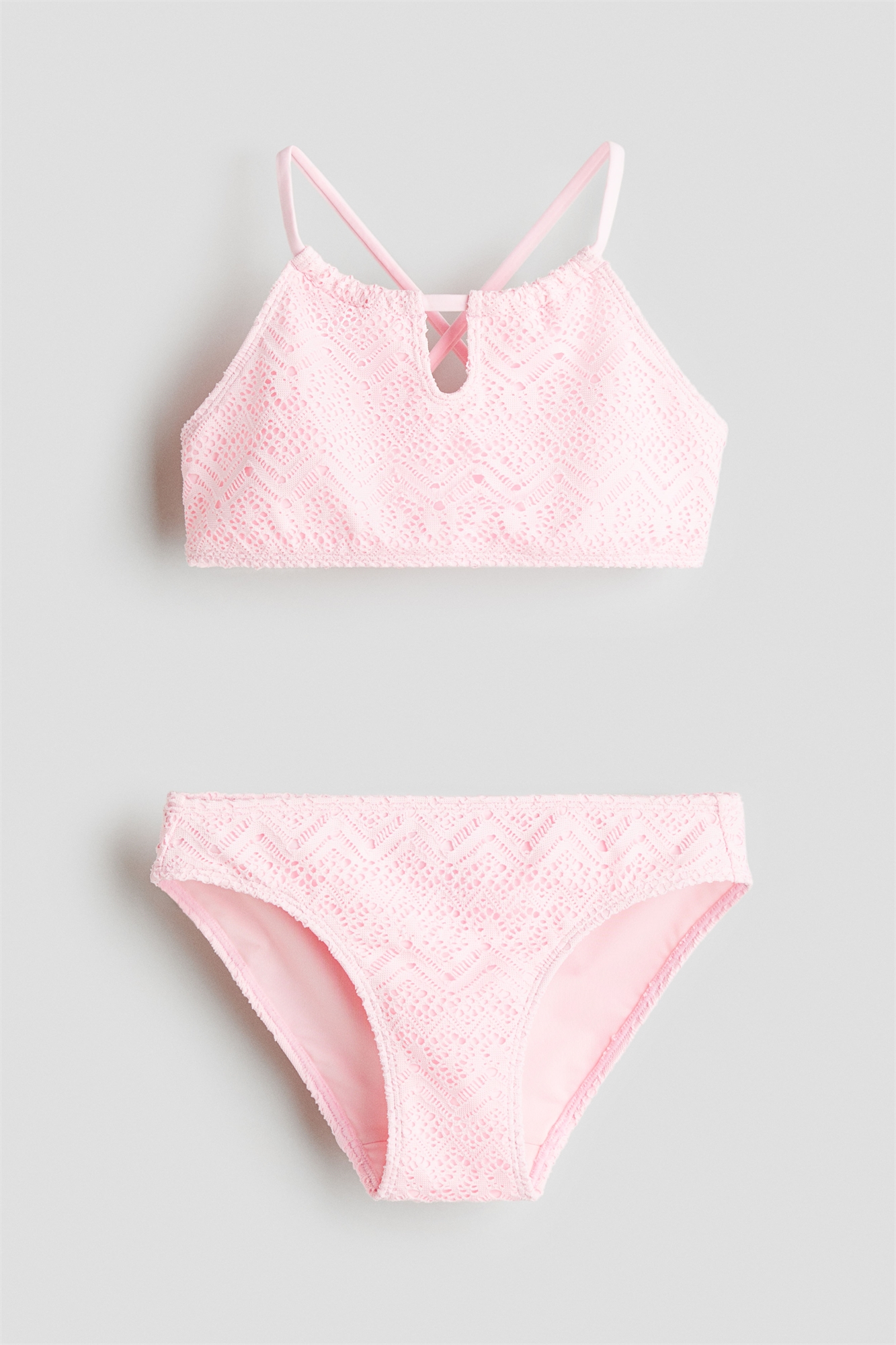 Полностью закрытое бикини на подкладке с вязаным узором. Топ узкого покроя с круглым вырезом, отверстием для ключа спереди и узкими бретелями, перекрещивающимися сзади.
