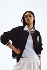 Бейсбольная куртка из ткани скуба с мотивом на спине. Небольшой отложной воротник, застежки на кнопки спереди и спущенные плечи. Карманы спереди, манжеты и подол в рубчик. На подкладке.