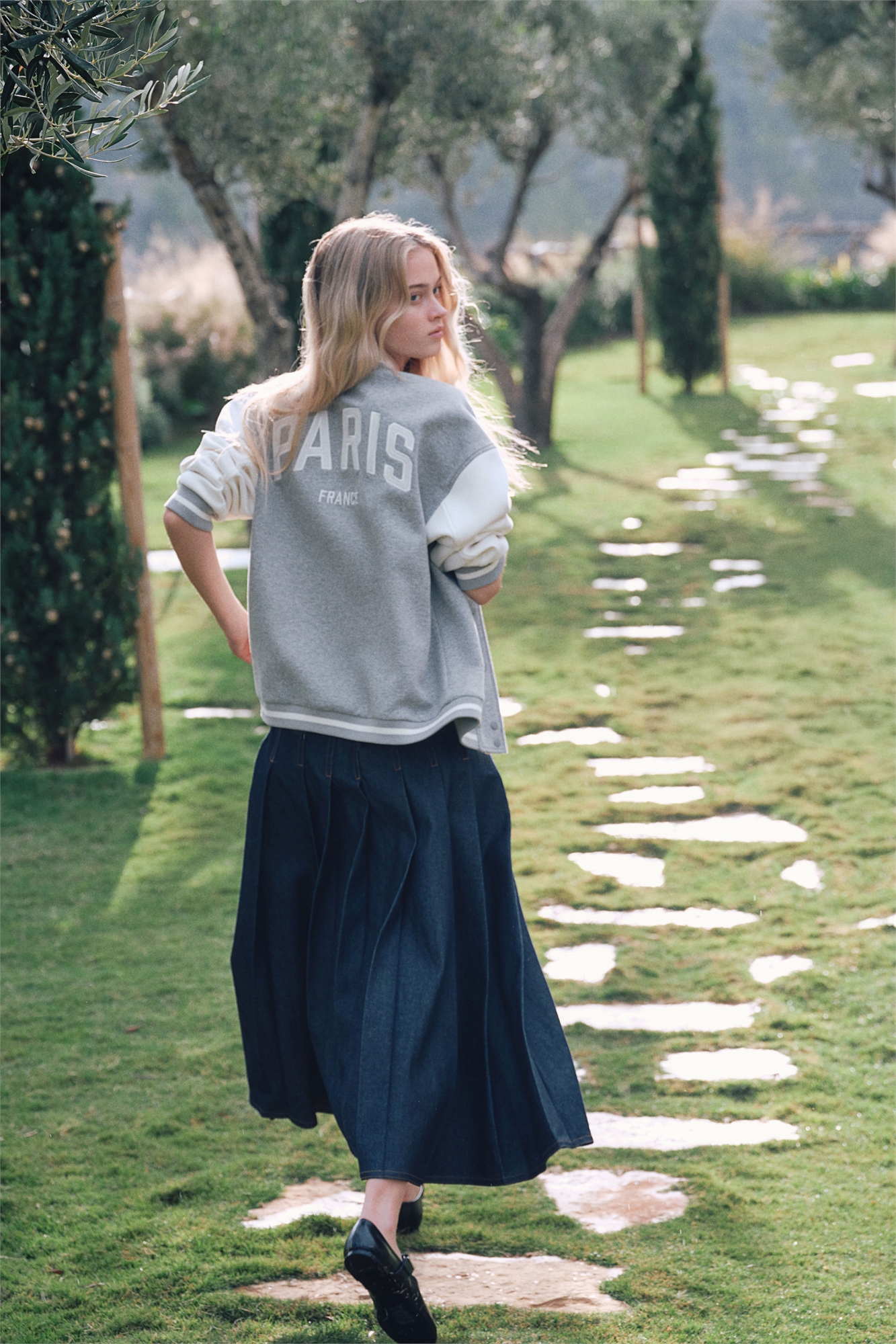 Бейсбольная куртка из ткани скуба с мотивом на спине. Небольшой отложной воротник, застежки на кнопки спереди и спущенные плечи. Карманы спереди, манжеты и подол в рубчик. На подкладке.