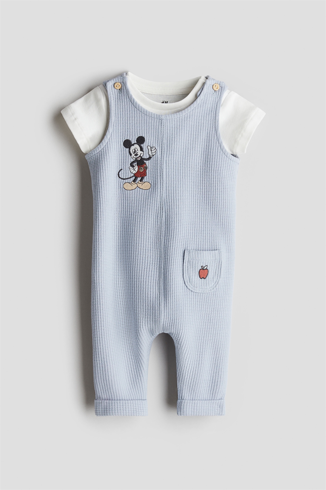 Комплект из полукомбинезона и комбинезона из мягкого хлопкового джерси. Вафельные полукомбинезоны с вышитыми мотивами и открытым накладным карманом спереди. Круглый вырез, бретели на плечах с застежкой на пуговицы и вшитые подвороты по краям. Боди с короткими рукавами, круглым вырезом и кнопками на одном плече и внизу для удобства переодевания.
