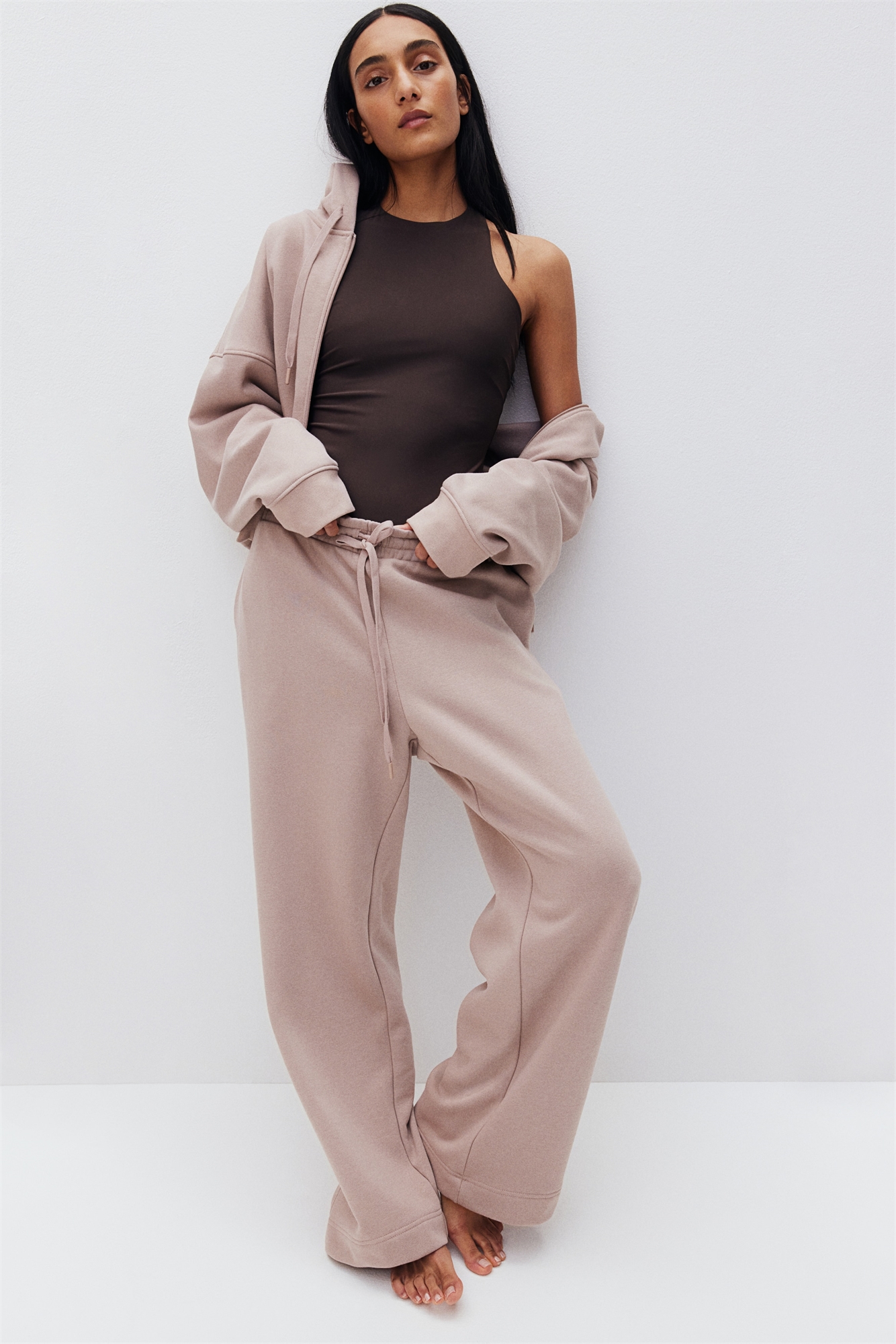 Брюки из хлопковой смеси с мягким начесом внутри. Эластичный пояс с завязками, незаметные боковые карманы и широкие штанины.