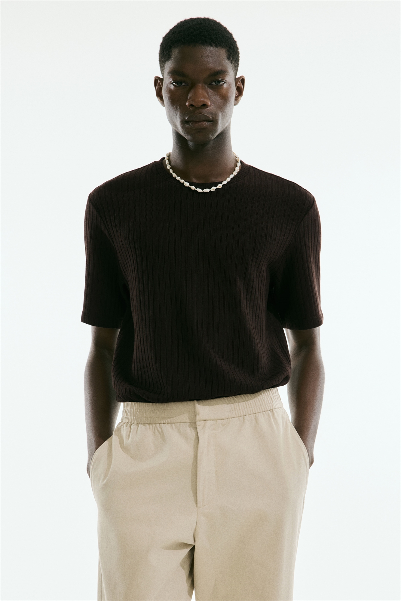 Футболка из мягкого ребристого трикотажа из вискозы с круглым вырезом. Регулярный крой для комфортной носки и классического силуэта.