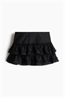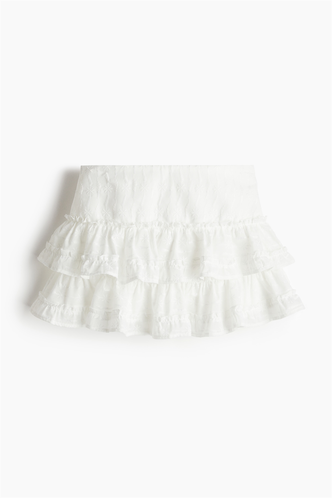 Короткая юбка из тканого материала с вышитым узором. Застежка-молния с одной стороны и ярусы с оборками. На подкладке.