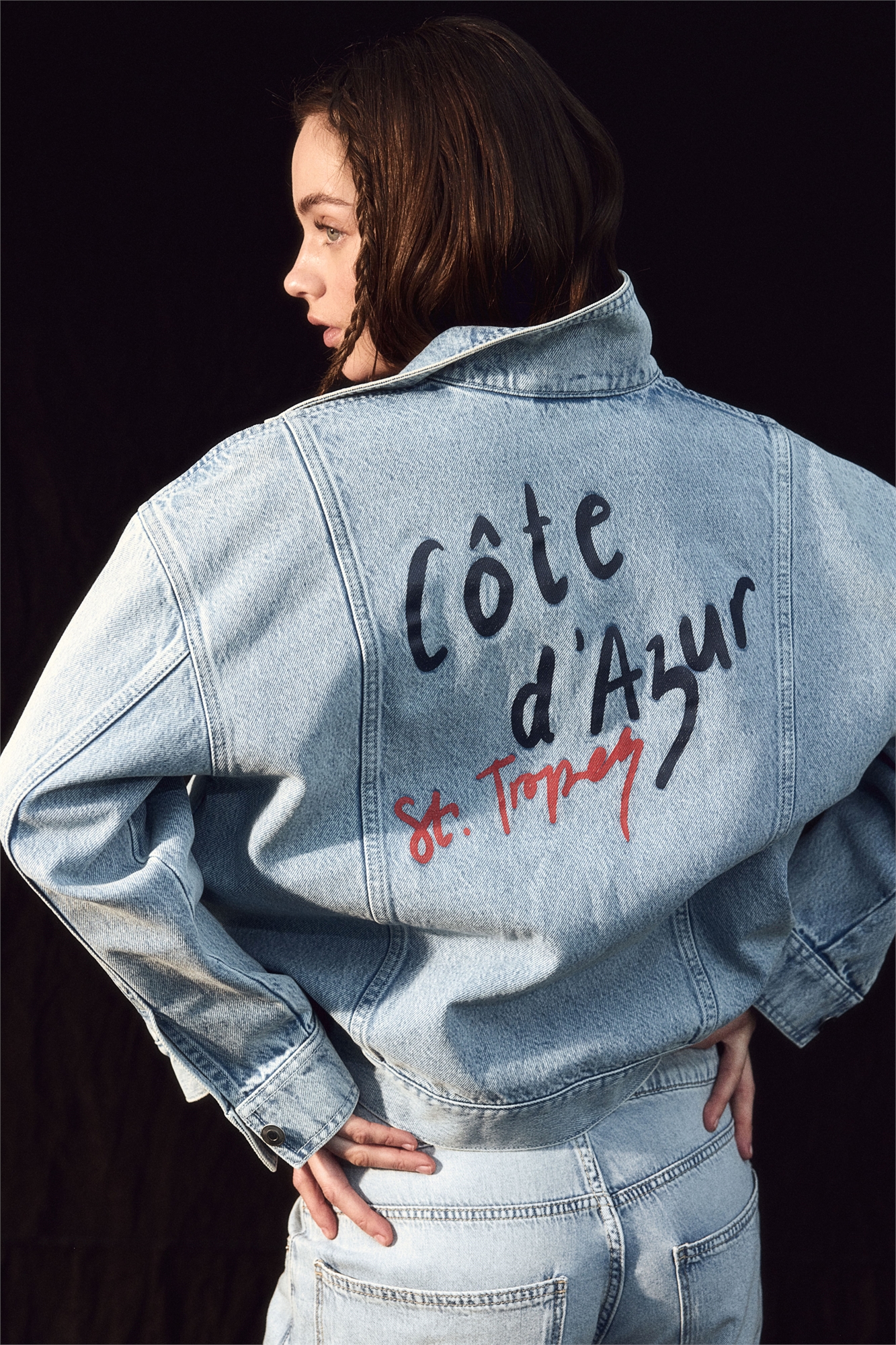 Куртка в стиле дальнобойщика из жесткого хлопкового денима с воротником, металлическими пуговицами спереди, направленными вперед плечевыми швами и ярмом спереди и сзади. Спущенные плечи, манжеты на пуговицах, накладные нагрудные карманы на пуговице и прорезные передние карманы.