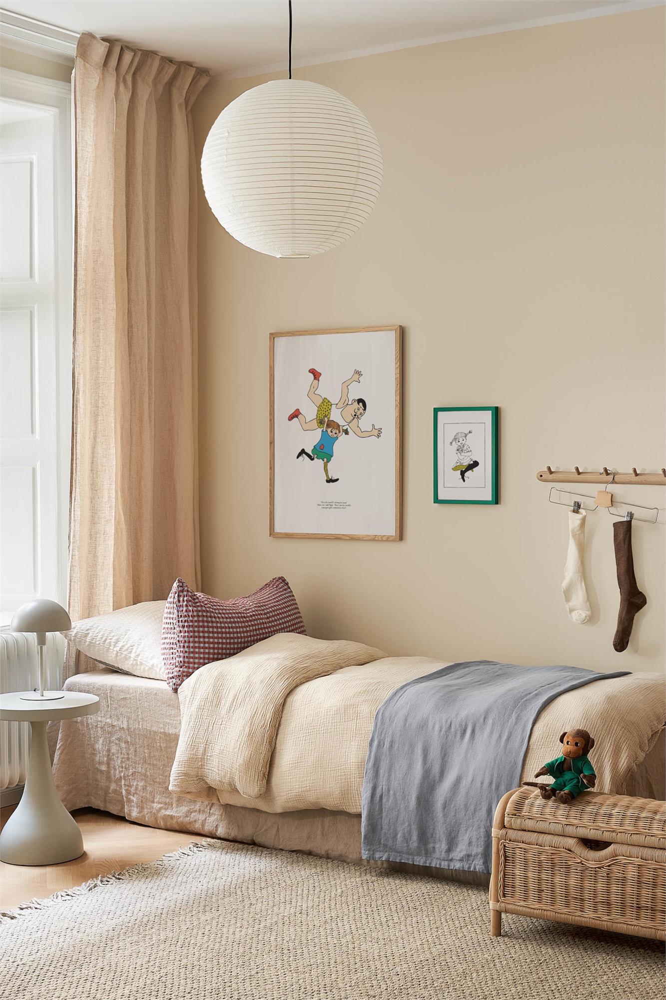 Пеппи Длинныйчулок - нестареющий персонаж, созданный шведской писательницей Астрид Линдгрен. С ее добротой, оранжевыми косами, веснушчатым лицом и удивительной силой, Пеппи живет полной приключений жизнью на вилле Виллекулла в сопровождении лошади Лиллы Губбен (Маленького Старика) и обезьянки Мистера Нильссона. С 1945 года Пеппи покоряет сердца читателей по всему миру, став любимым символом свободы, силы и нестандартных решений. Иллюстрации выполнены Ингрид Ванг Найман. Иллюстрация с изображением Пиппи Длинныйчулок, борющейся с цирковым силачом через голову. Под картинкой на английском языке написана цитата из Пиппи. Мотив изображен на бежевом фоне.