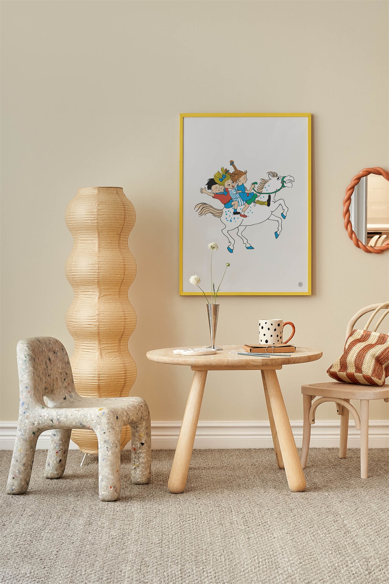 Пеппи Длинныйчулок - нестареющий персонаж, созданный шведской писательницей Астрид Линдгрен. С ее добротой, оранжевыми косами, веснушчатым лицом и удивительной силой, Пеппи живет полной приключений жизнью на вилле Виллекулла в сопровождении лошади Лиллы Губбен (Маленького Старика) и обезьянки Мистера Нильссона. С 1945 года Пеппи покоряет сердца читателей по всему миру, став любимым символом свободы, силы и нестандартных решений. Иллюстрации выполнены Ингрид Ванг Найман. Иллюстрация с изображением Пеппи Длинныйчулок верхом на своей лошади Лилле Губбен вместе со своими друзьями Анникой и Томми. Мотив изображен на бежевом фоне.