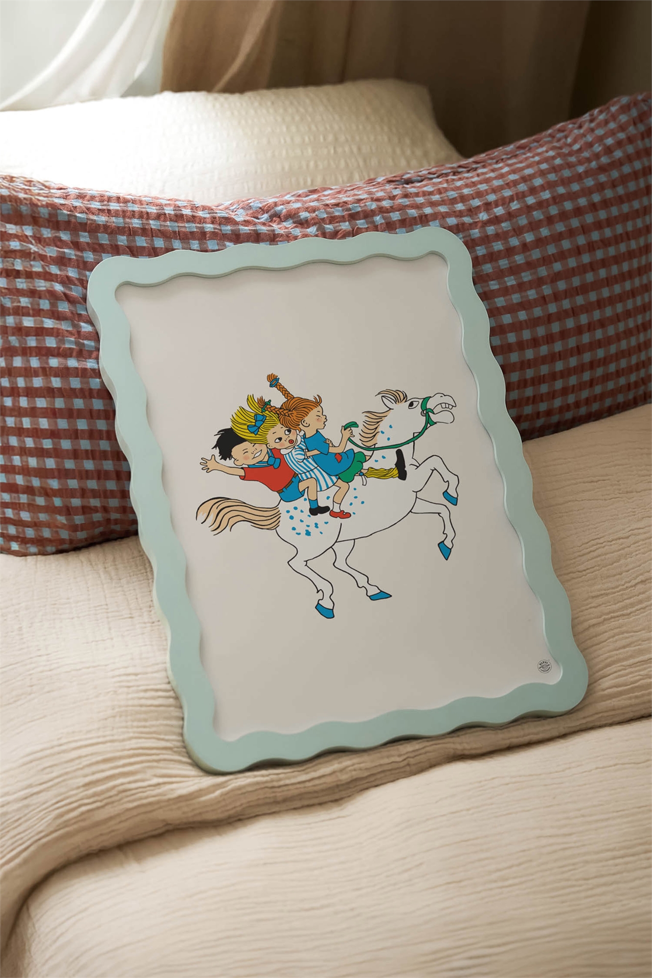 Пеппи Длинныйчулок - нестареющий персонаж, созданный шведской писательницей Астрид Линдгрен. С ее добротой, оранжевыми косами, веснушчатым лицом и удивительной силой, Пеппи живет полной приключений жизнью на вилле Виллекулла в сопровождении лошади Лиллы Губбен (Маленького Старика) и обезьянки Мистера Нильссона. С 1945 года Пеппи покоряет сердца читателей по всему миру, став любимым символом свободы, силы и нестандартных решений. Иллюстрации выполнены Ингрид Ванг Найман. Иллюстрация с изображением Пеппи Длинныйчулок верхом на своей лошади Лилле Губбен вместе со своими друзьями Анникой и Томми. Мотив изображен на бежевом фоне.