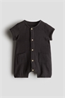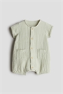 Ромпер из мягкого хлопкового муслина. Круглый вырез, застежка на пуговицы спереди и короткие рукава с пришитыми оборочками на манжетах. Потайные кнопки на ножках для удобства переодевания и узкая эластичная резинка по краям.