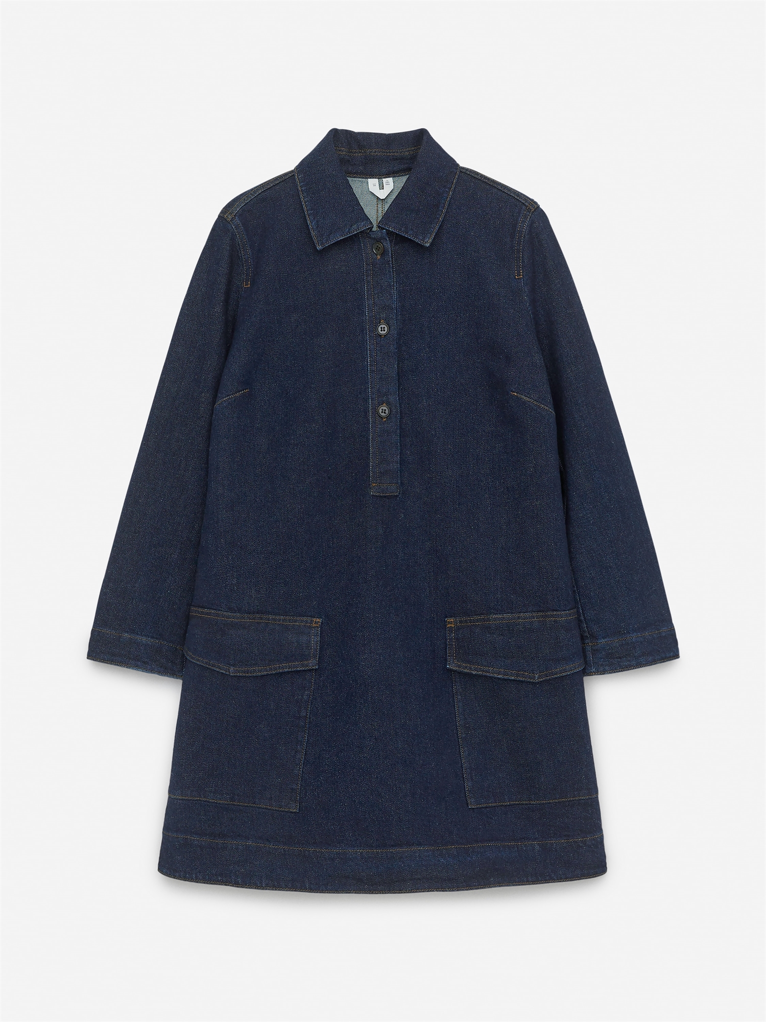 Джинсовое платье короткой длины сшито из хлопка с добавлением эластана. Застежка на пуговицы и накладные карманы.