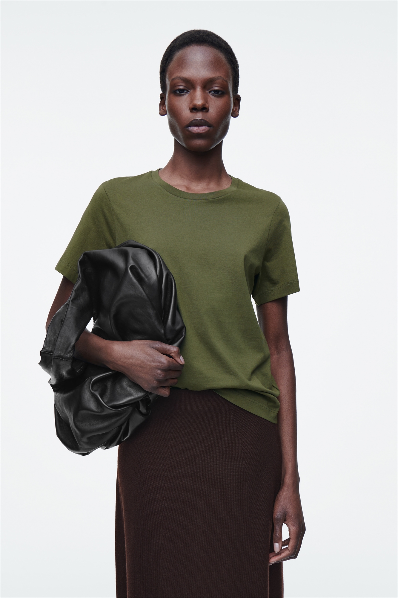 Команда женской одежды COS представляет икону повседневности, доведенную до совершенства. Эта изысканная футболка сшита из легкого хлопка-джерси плотностью 150 г, выбранного за его комфорт и непревзойденную мягкость. Она имеет классический покрой с вырезом для экипажа и выполнена в земляном оливковом цвете. Regular fit, 150gsm Материал: 100% хлопок. Без учета отделки / Машинная стирка Длина по спинке для размера S составляет 60,8 см / Модель носит размер S