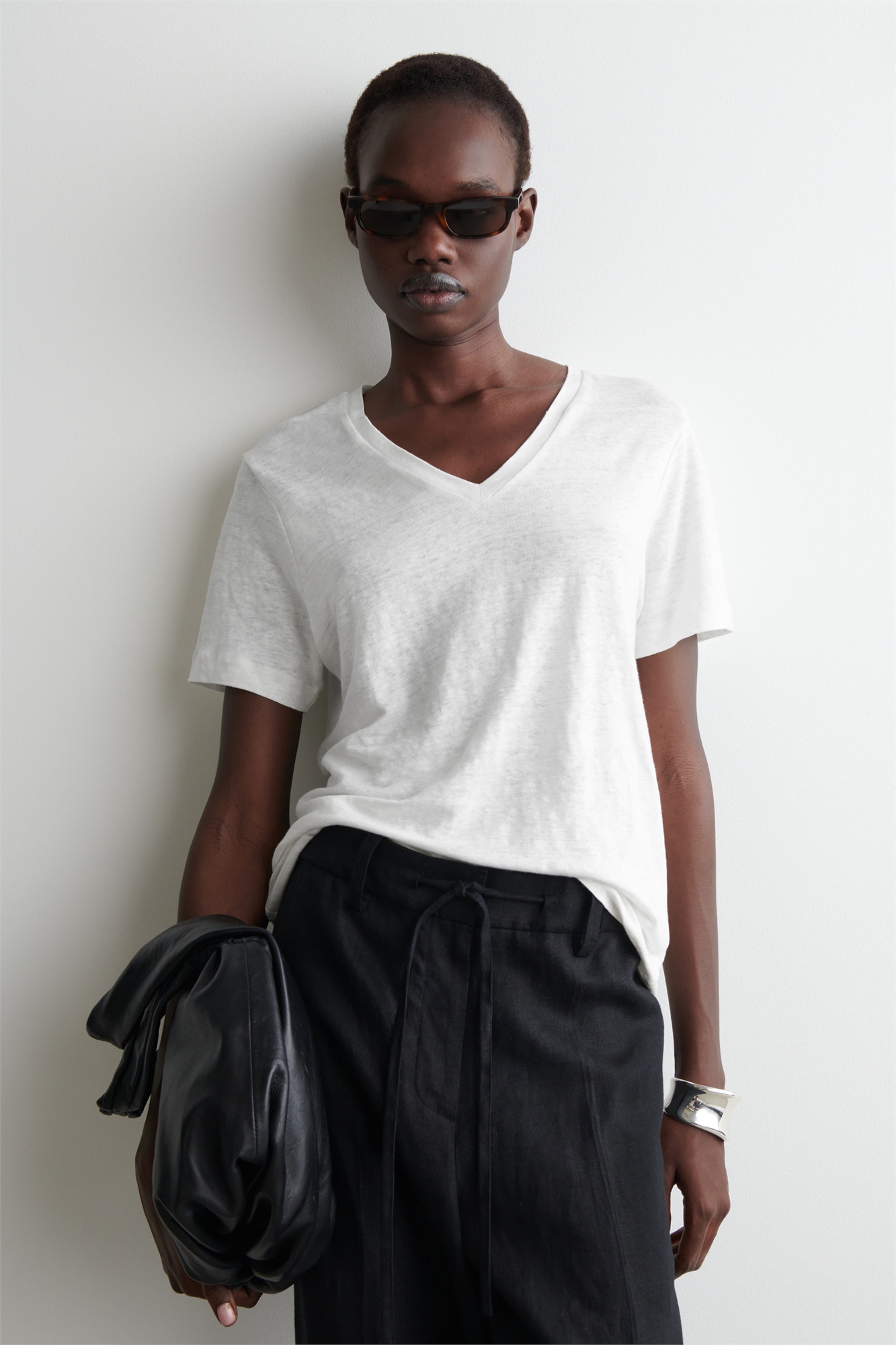 Команда женской одежды COS представляет повседневную икону, доведенную до совершенства. Эта изысканная футболка сшита из европейского льна плотностью 210 г, выбранного за его естественную воздухопроницаемость и мягкость. Она имеет классический V-образный вырез и выполнена в стойком черном цвете. Regular fit, 210gsmEuropean Flax™ linen is a premium quality flax fibre, grown without use irrigation, except in exceptional circumstances, or genetically modified seeds Shell: 100% European Flax™. Без учета отделки / Машинная стирка Длина по спинке для размера S составляет 59,4 см / Модель носит размер S