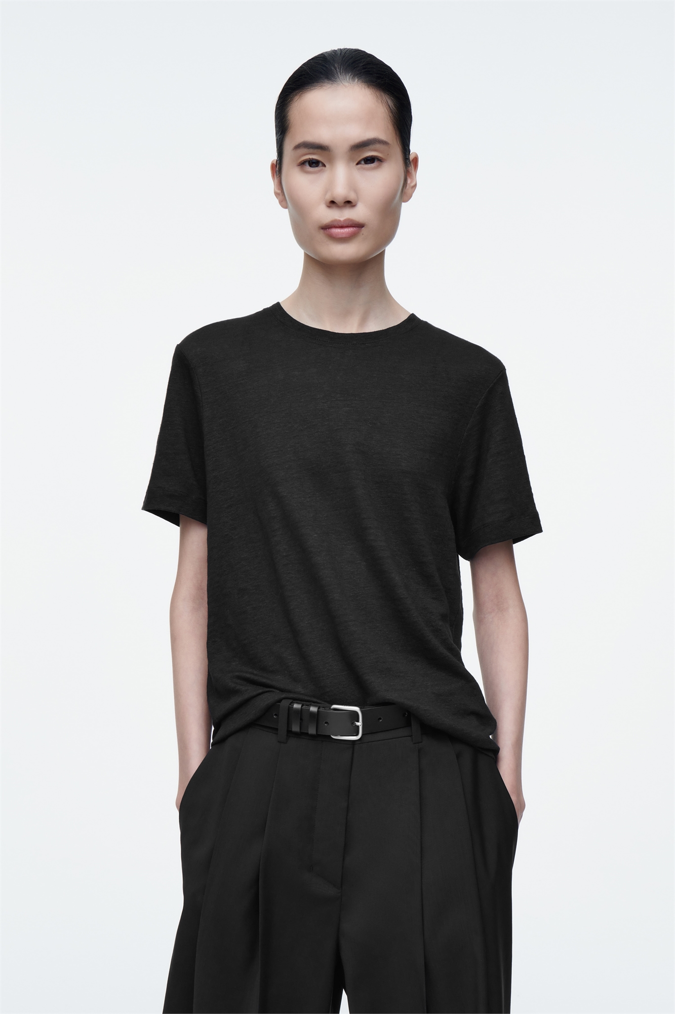 Команда женской одежды COS представляет икону повседневности, доведенную до совершенства. Эта изысканная футболка изготовлена из европейского льняного трикотажа 210gsm, выбранного за его естественную воздухопроницаемость и мягкость. Она имеет классический крой с вырезом для экипажа и выполнена в строгом черном цвете. Regular fit, 210gsm Европейский лен™ - это высококачественное льняное волокно, выращенное без использования ирригации, кроме исключительных случаев, или генетически модифицированных семян Оболочка: 100% европейский лен™. Без учета отделки / Машинная стирка Длина по спинке для размера S составляет 60,8 см / Модель носит размер S