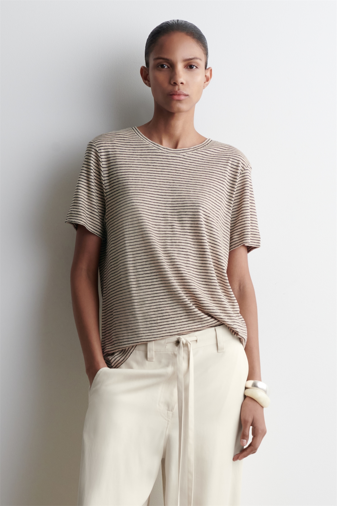 Команда женской одежды COS представляет икону повседневности, доведенную до совершенства. Эта изысканная футболка изготовлена из европейского льняного трикотажа 210gsm, выбранного за его естественную воздухопроницаемость и мягкость. Она имеет классический крой с вырезом для экипажа и выполнена в неизменно белом цвете. Regular fit, 210gsm Европейский лен™ - это высококачественное льняное волокно, выращенное без использования ирригации, кроме исключительных случаев, или генетически модифицированных семян Оболочка: 100% европейский лен™. Без учета отделки / Машинная стирка Длина по спинке для размера S составляет 60,8 см / Модель носит размер S