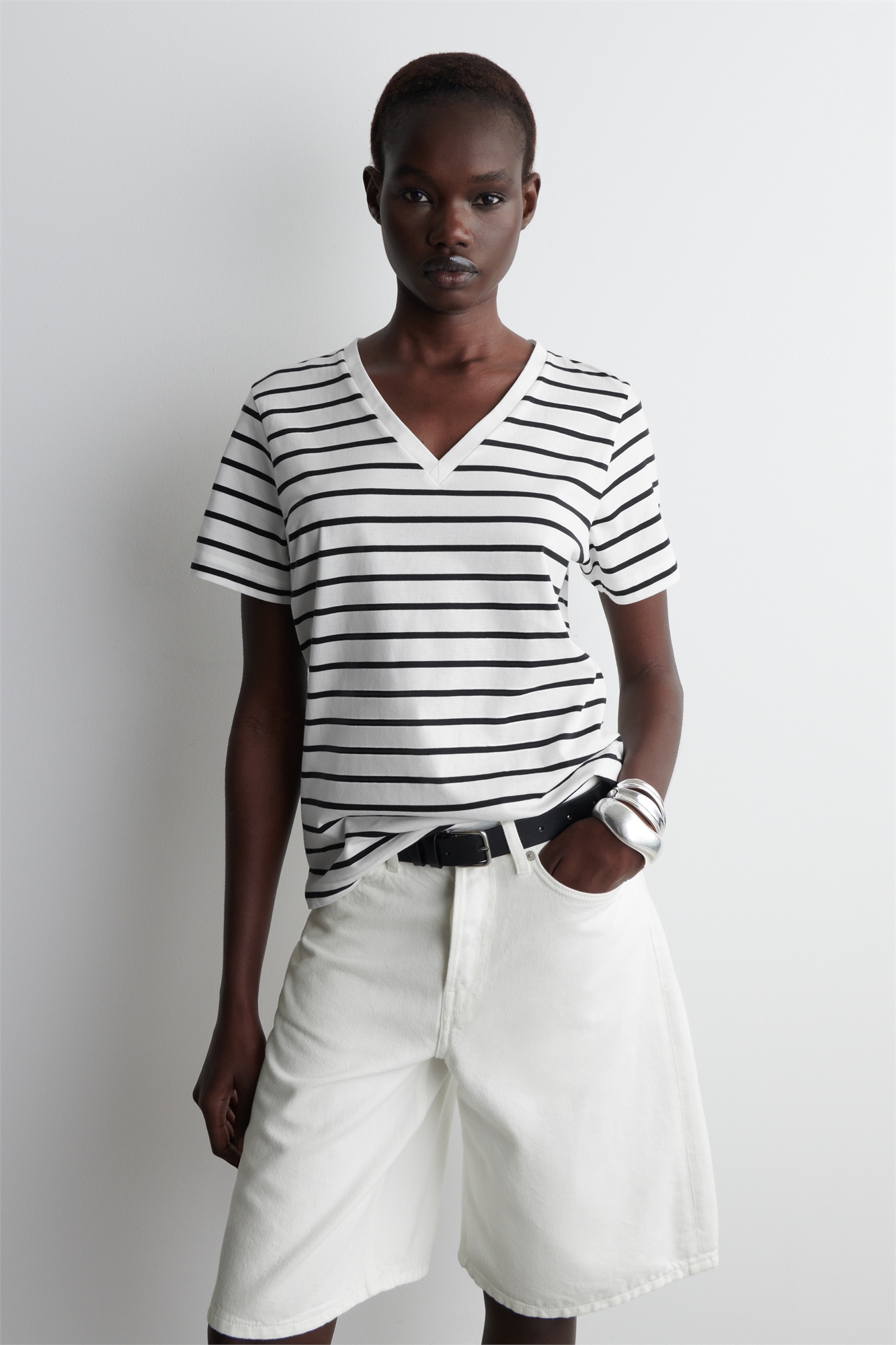Команда женской одежды COS представляет икону повседневности, доведенную до совершенства. Эта изысканная футболка сшита из легкого хлопка-джерси плотностью 150 г, который выбирают за его комфорт и непревзойденную мягкость. Она имеет классический V-образный вырез и выполнена в стойком темно-синем цвете. Regular fit, 150gsm Материал: 100% хлопок. Без учета отделки / Машинная стирка Длина по спинке для размера S составляет 60,8 см / Модель носит размер S