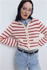 Короткий кардиган из фактурного трикотажа с круглым вырезом, металлическими пуговицами спереди, длинными рукавами и фальшивыми передними карманами с пуговицей. Окантовка по вырезу горловины, по краю пуговиц, на манжетах и подоле.
