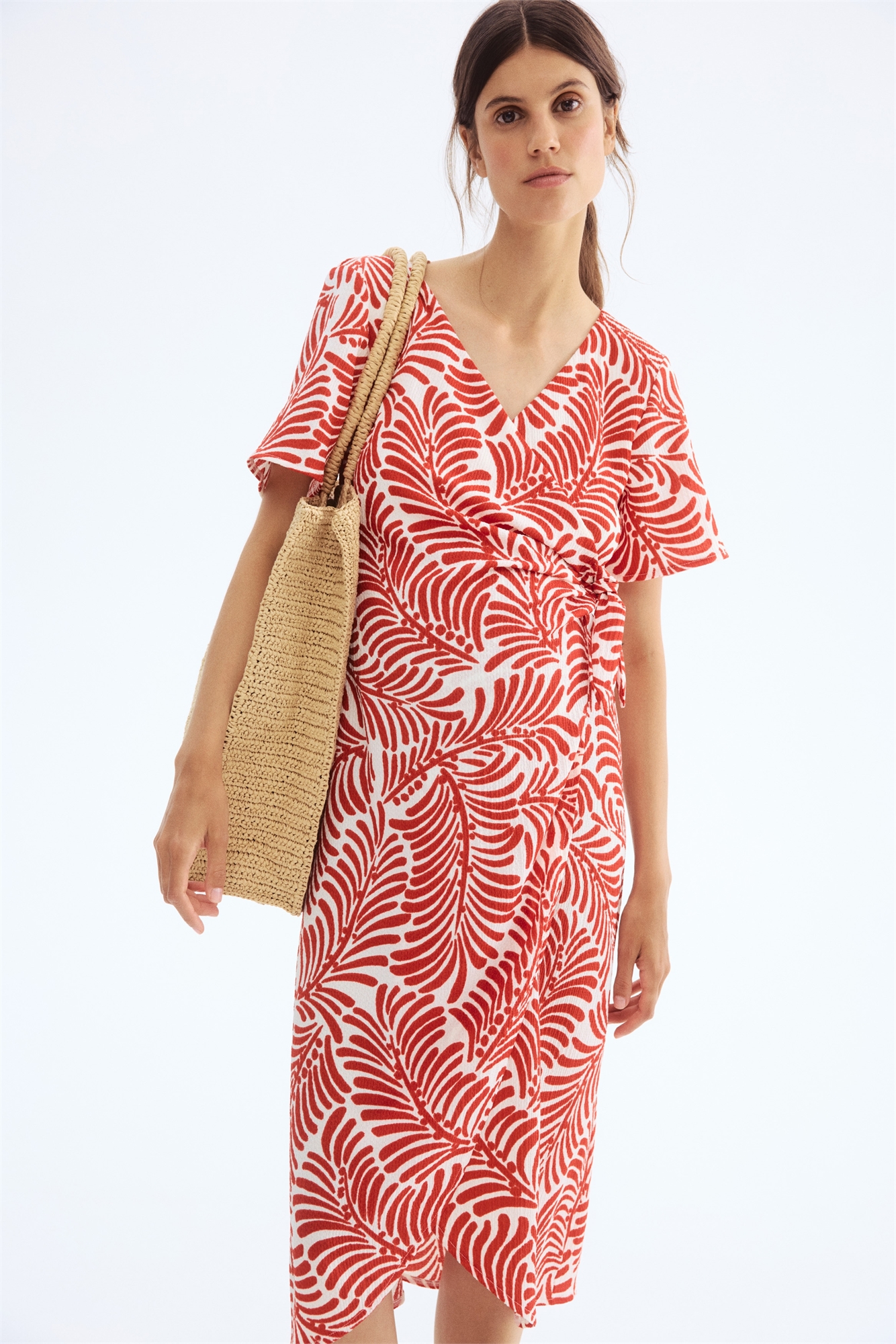 Платье длиной до колена из мятого джерси с короткими рукавами, V-образным вырезом горловины и завязками с одной стороны и потайной пуговицей с другой. Частично на подкладке.