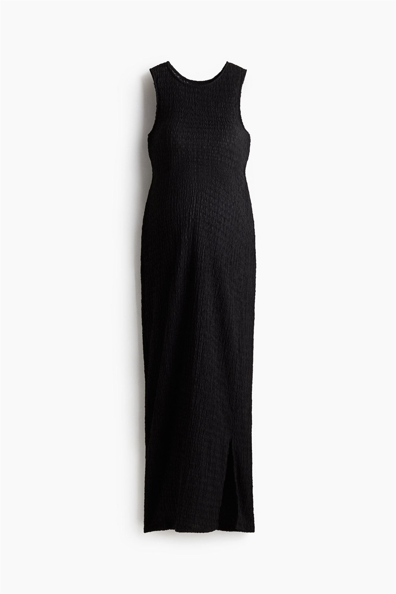 Приталенное платье длиной до щиколоток из фактурного джерси без рукавов, с круглым вырезом и прямым покроем с разрезом с одной стороны.