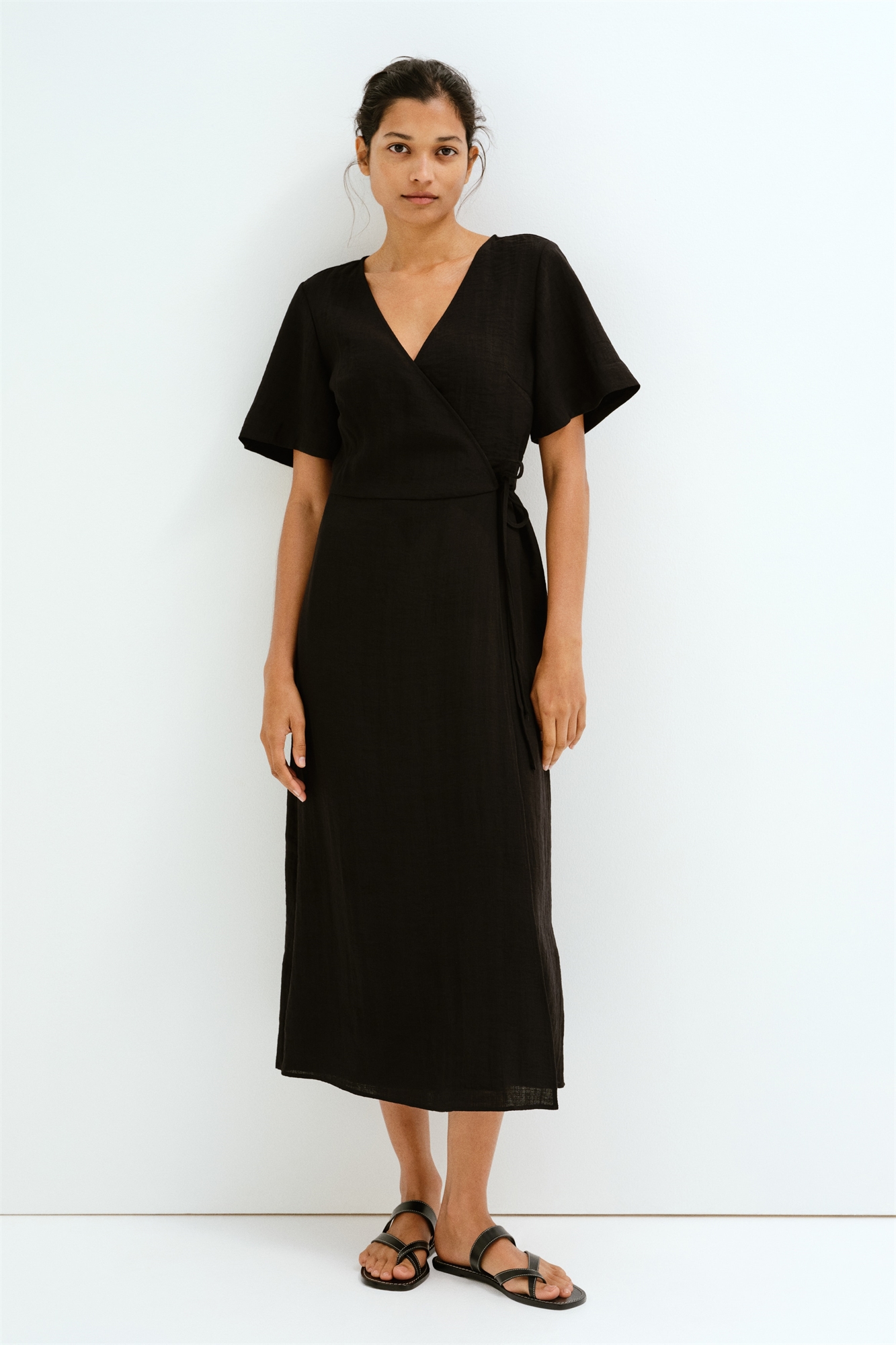 Платье для кормящих длиной до колен из тканого материала с V-образным вырезом, короткими рукавами и завязками спереди с одной стороны и потайными завязками с другой. Практичный внутренний верх для облегчения доступа к груди.