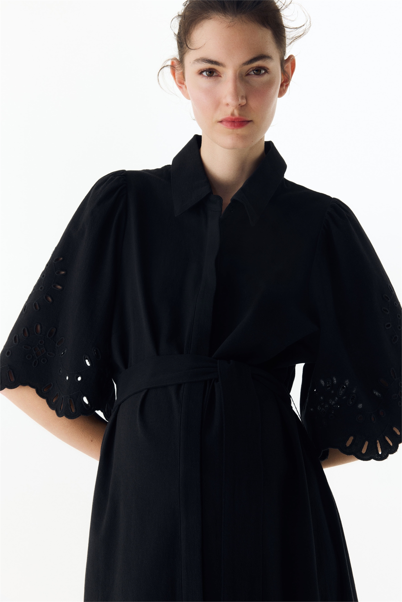 Платье-рубашка длиной до колен из хлопкового крепа с воротником, потайными пуговицами спереди и широким съемным поясом-завязкой под бюстом. Рукава длиной до локтя с манжетами с гребешками. Без подкладки.