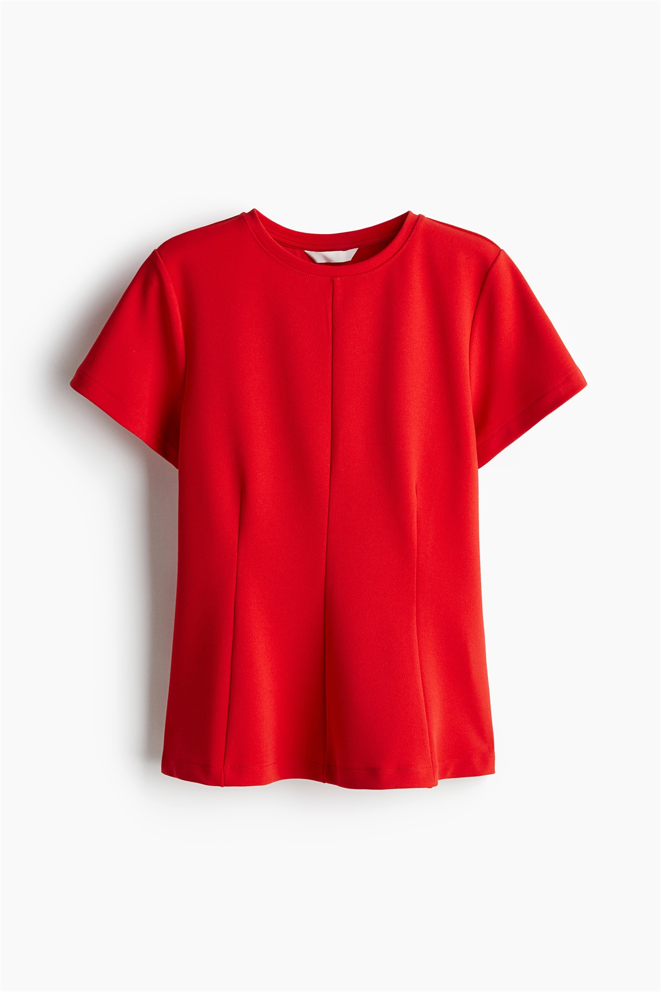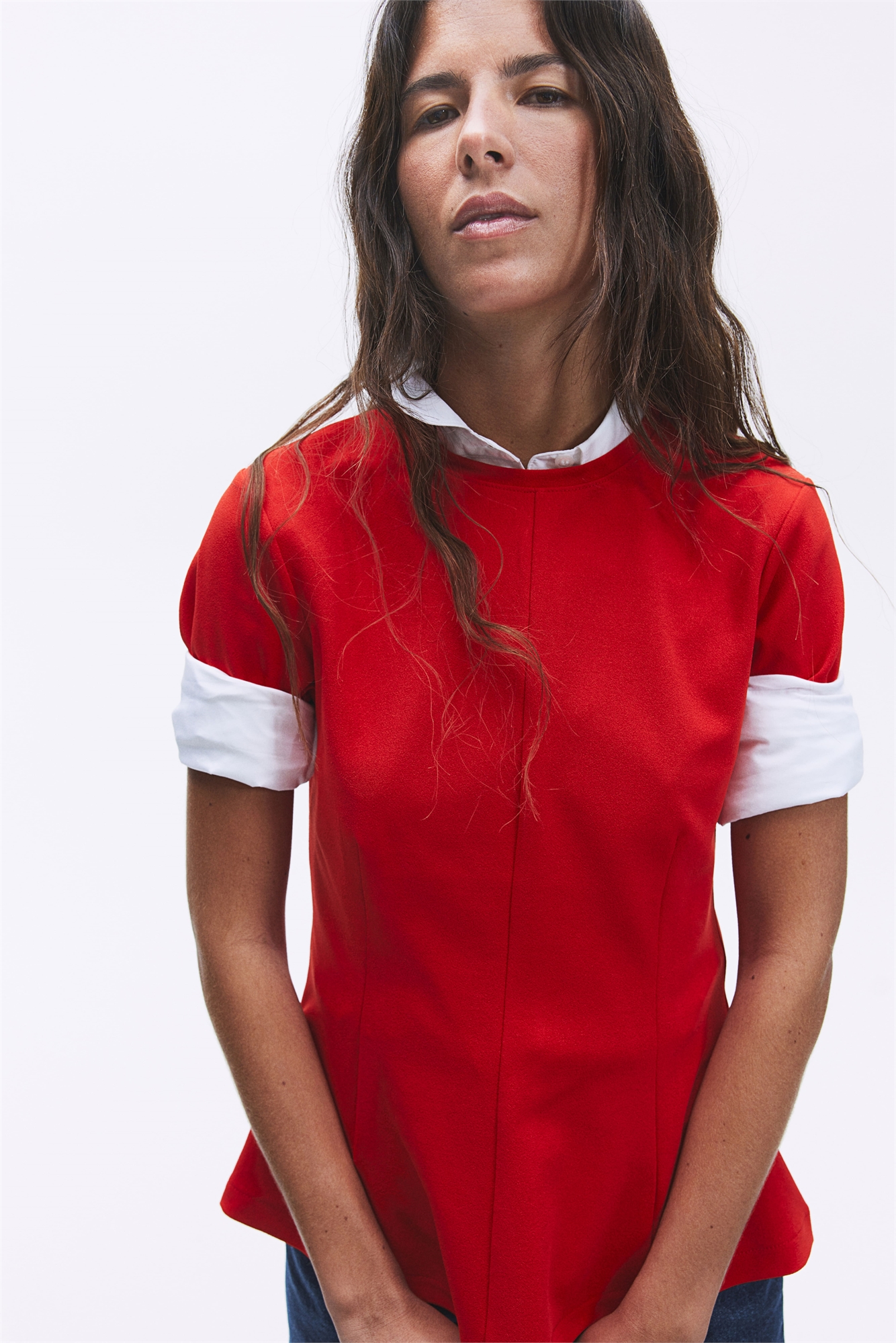 Облегающий топ из плотного трикотажа интерлок с круглым вырезом и короткими рукавами. Формирующие вытачки на талии и расклешенный подол.
