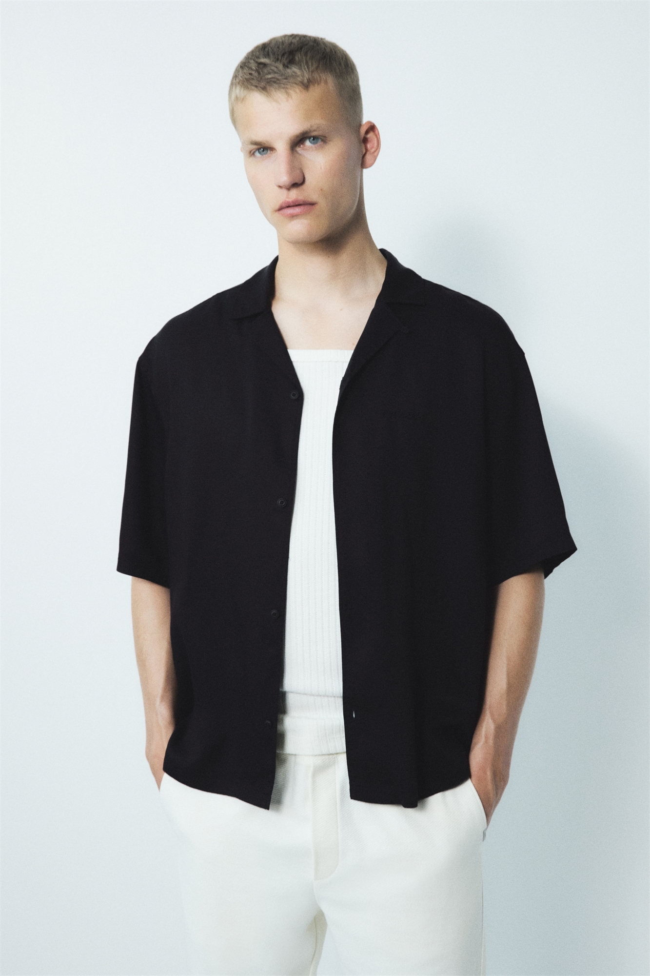 Рубашка из лиоцеллового плетения с вышитым мотивом на груди. Курортный воротник, французский перед, короткие рукава и прямой подол с разрезом с каждой стороны. Свободный крой для пышного, но не чрезмерно большого силуэта. Ткань из лиоцелла очень мягкая, устойчивая к сминанию и прекрасно драпируется.