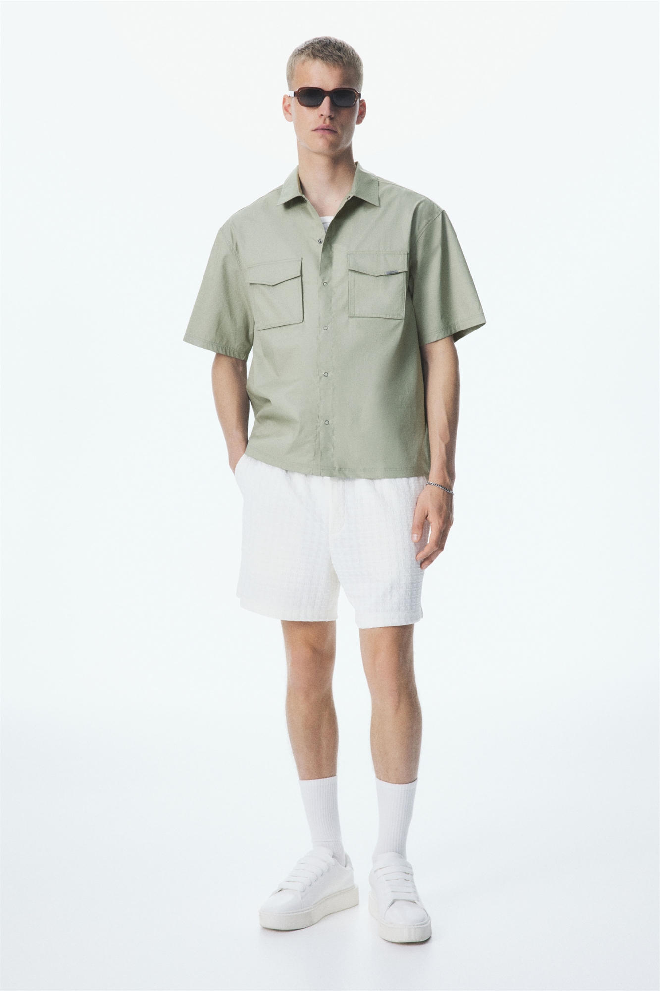 Рубашка с короткими рукавами из мягкого хлопкового полотна с отложным воротником, классическим передом с кнопками, передом, накладными нагрудными карманами и прямым покроем. Свободный крой для пышного, но не чрезмерно большого силуэта.