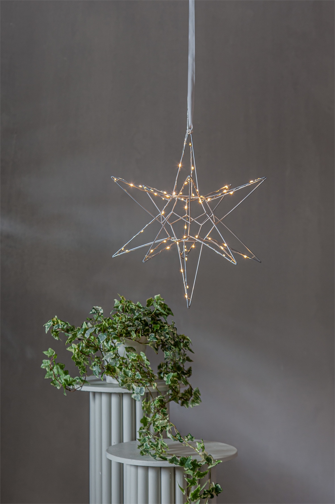 Декоративная металлическая 3D-звезда для внутреннего использования. Оснащена 60 теплыми белыми светодиодными лампочками. Это красивое украшение можно не только повесить, но и прекрасно смотрится на серванте. Диаметр: 47 см. Длина соединительного кабеля: 350 см.