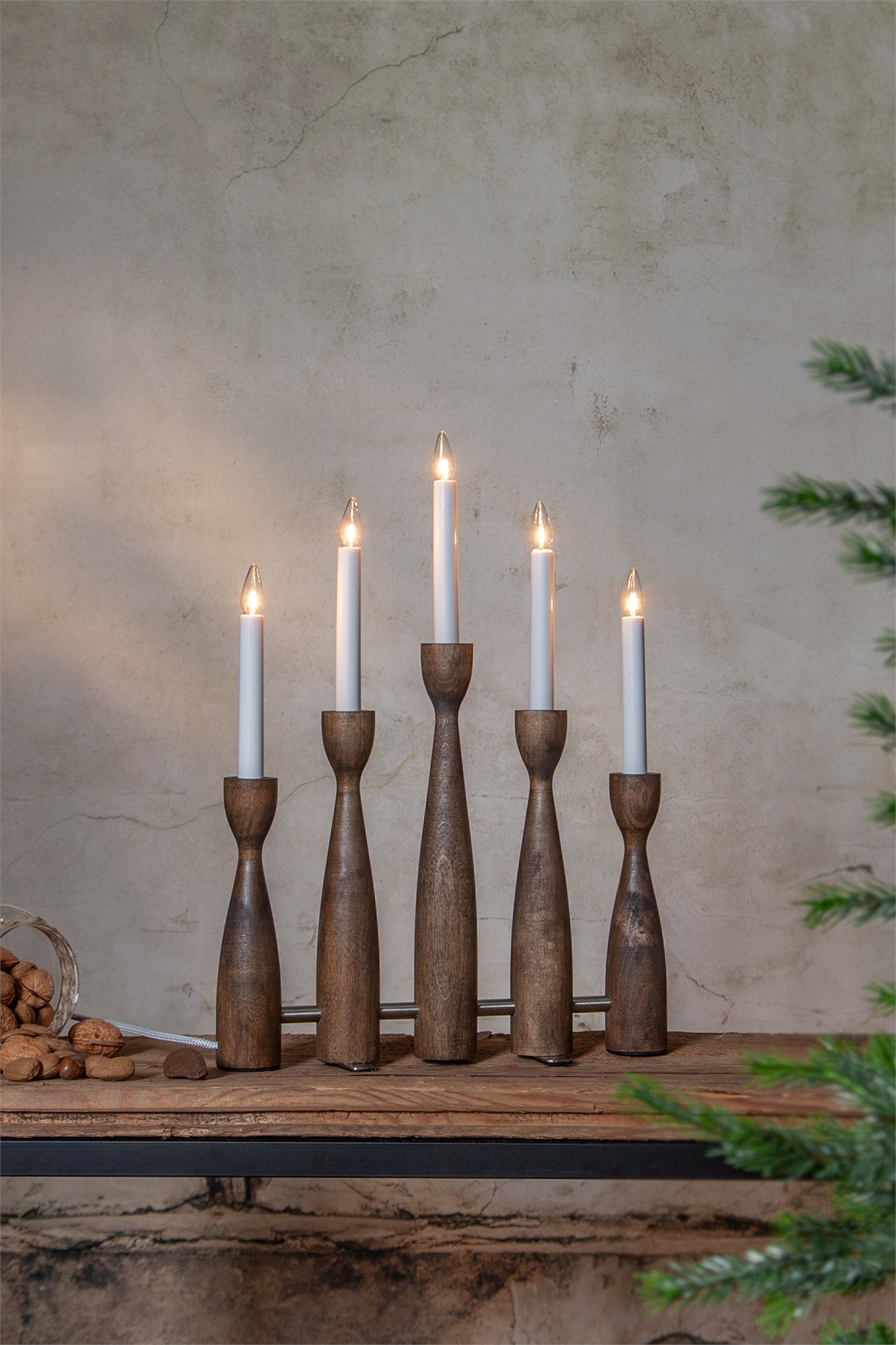 Элегантный современный деревянный адвент-подсвечник. Металлическая трубка соединяет поворотные подсвечники. Текстильный кабель длиной 180 см с выключателем. Привлекает внимание на окне или на серванте. Стильный адвентский подсвечник излучает рождественское настроение. Высота модели - 47 см, ширина - 35 см.