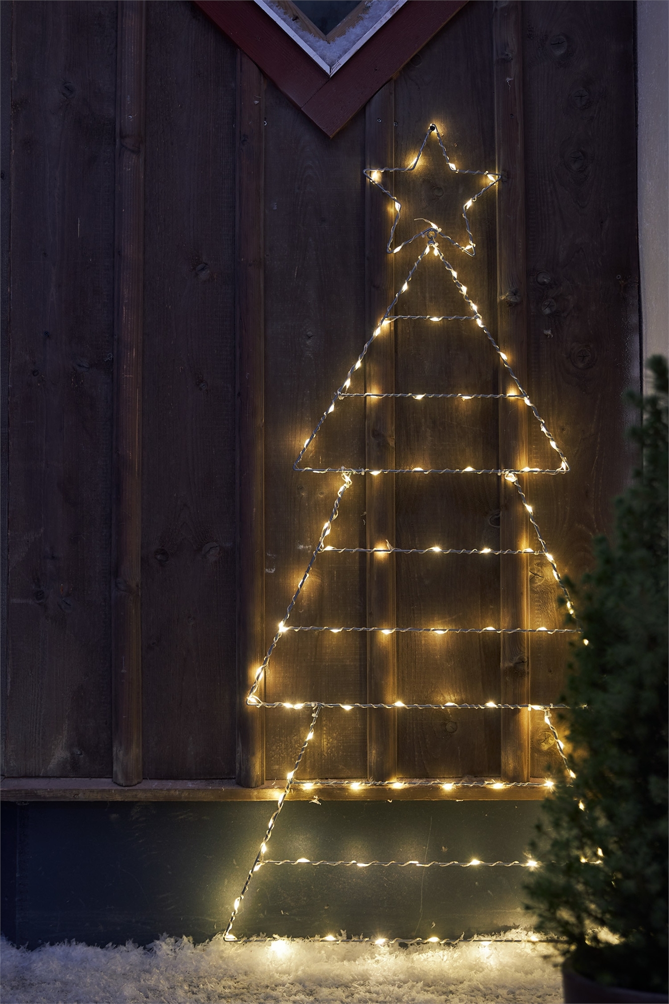 Стильный силуэт из металла серебристого цвета для использования внутри и снаружи помещений. Силуэт в форме елки можно сложить, чтобы сэкономить место при хранении. Модель имеет 120 светодиодов, распределенных на 120 см. Для крепления звезды в комплект входит кабельная стяжка. Работает от батареек (3 батарейки типа АА, не входят в комплект). Модель с функцией таймера.