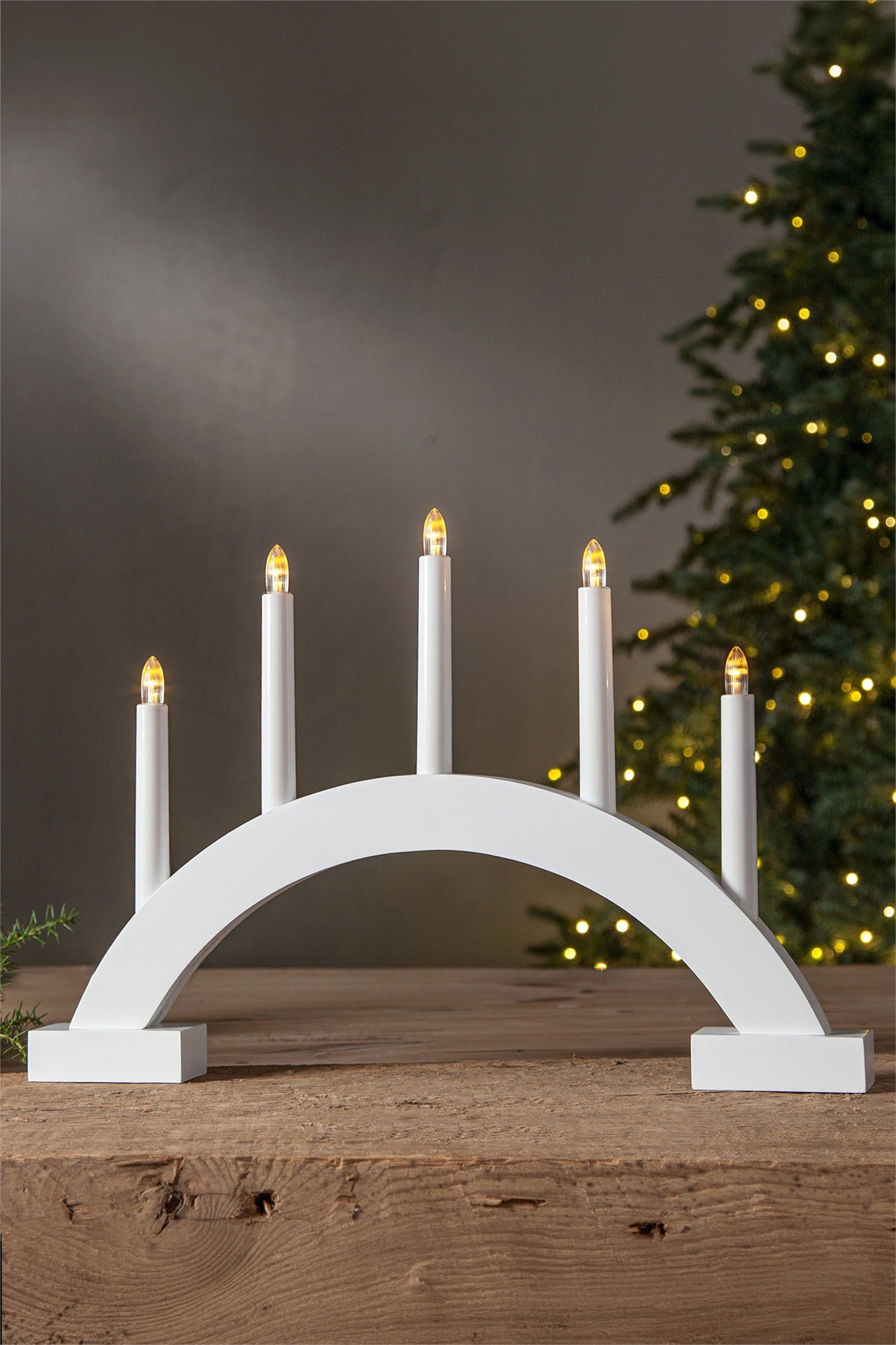 Деревянный адвент-подсвечник на батарейках в форме арки. Благодаря компактному размеру эта симпатичная модель легко поместится в окне или на серванте. Светодиодные лампочки с уютным свечением создают чудесную рождественскую атмосферу. Высота модели 32 см, ширина 46 см. Работает от батареек (2 батарейки типа АА, не входят в комплект). Продукт со знаком FSC®.