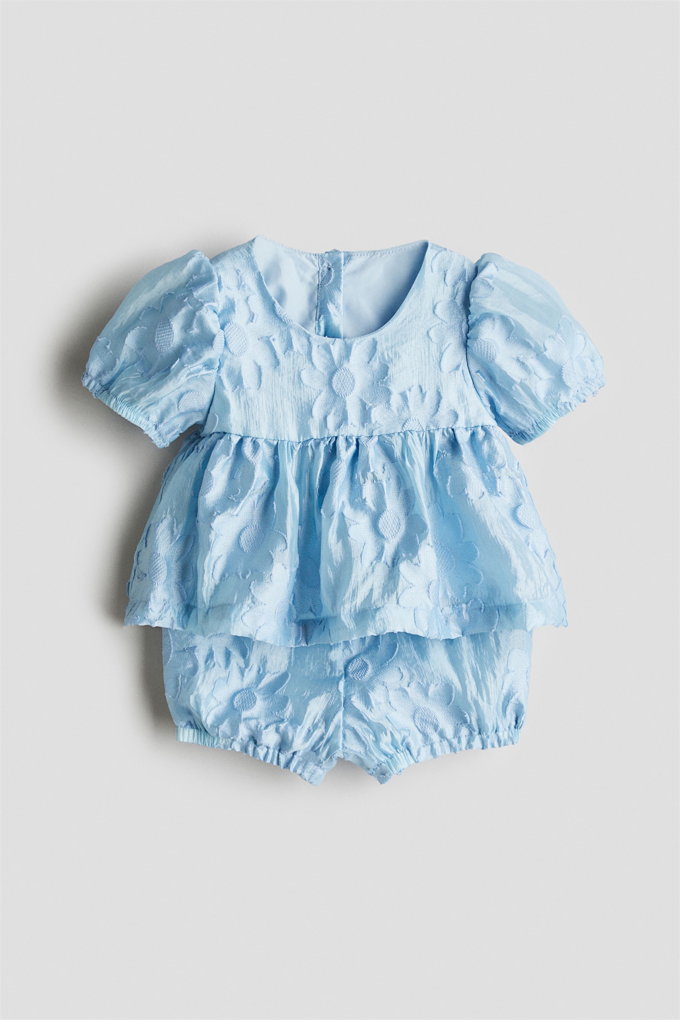 Комплект из блузки и трусиков-распашонок из мягкого, фактурного переплетения. Блузка с круглым вырезом, застежкой на пуговицы с деревянным рисунком сзади на шее и сборчатым швом над талией для более полного образа. Короткие объемные пышные рукава с узкими эластичными манжетами. Трусы с регулируемой резинкой на талии и узкой резинкой по краям.