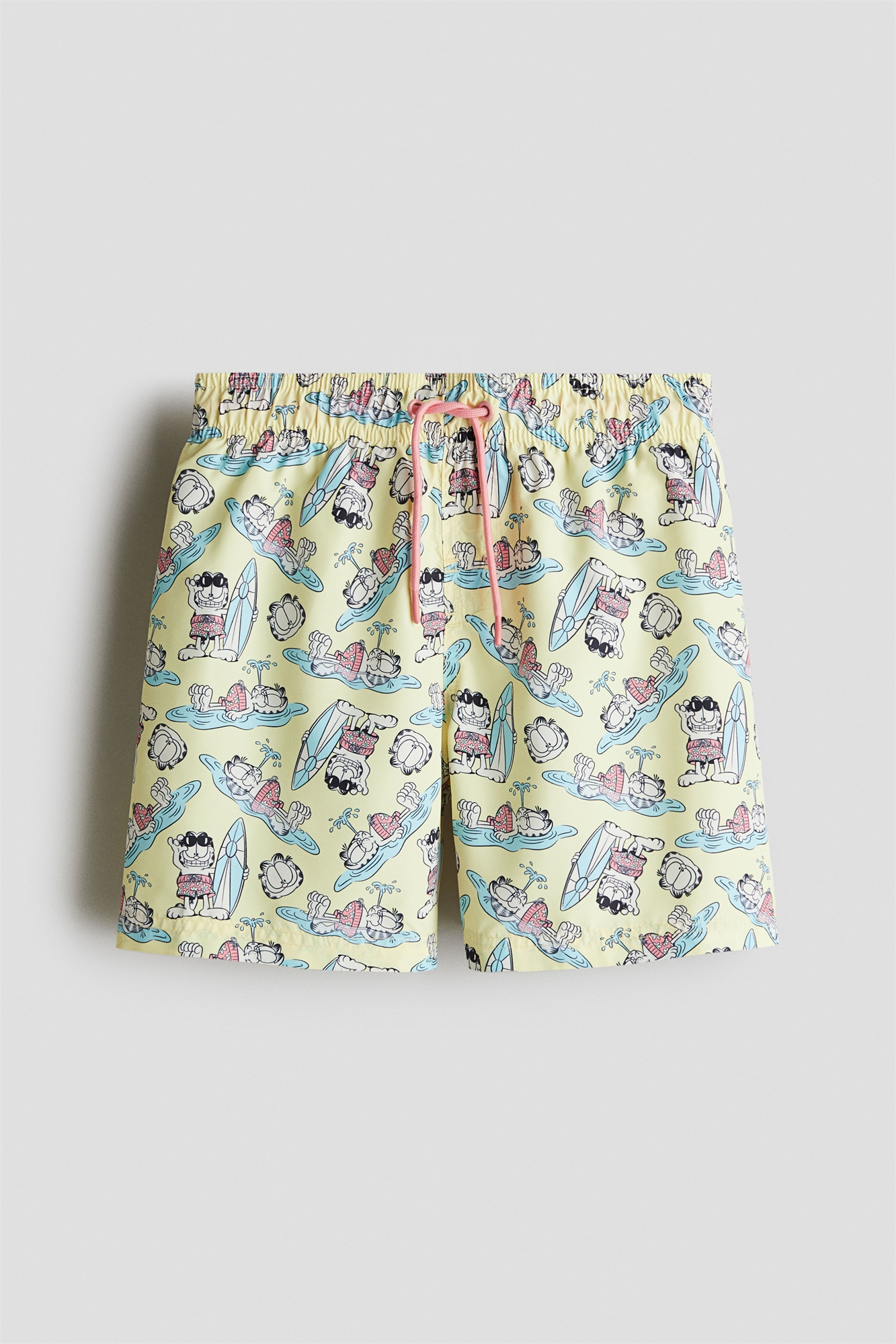 Купальные шорты с принтом с резинкой на поясе и шнурке, и открытым задним карманом с застежкой на крючок и петлю. Внутренние шорты из мягкой сетки.