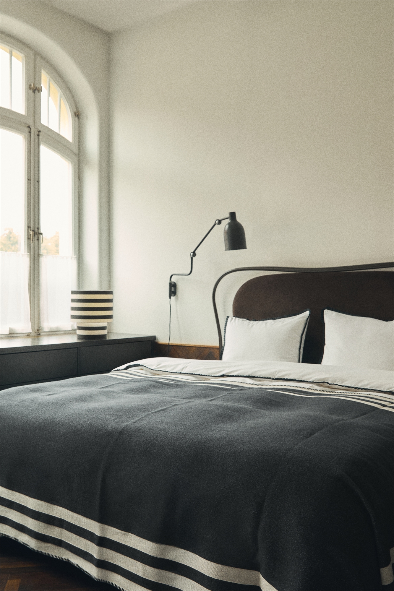 Жаккардовое покрывало из смеси хлопка и шерсти с полосатой каймой и одеяльной строчкой по краям.