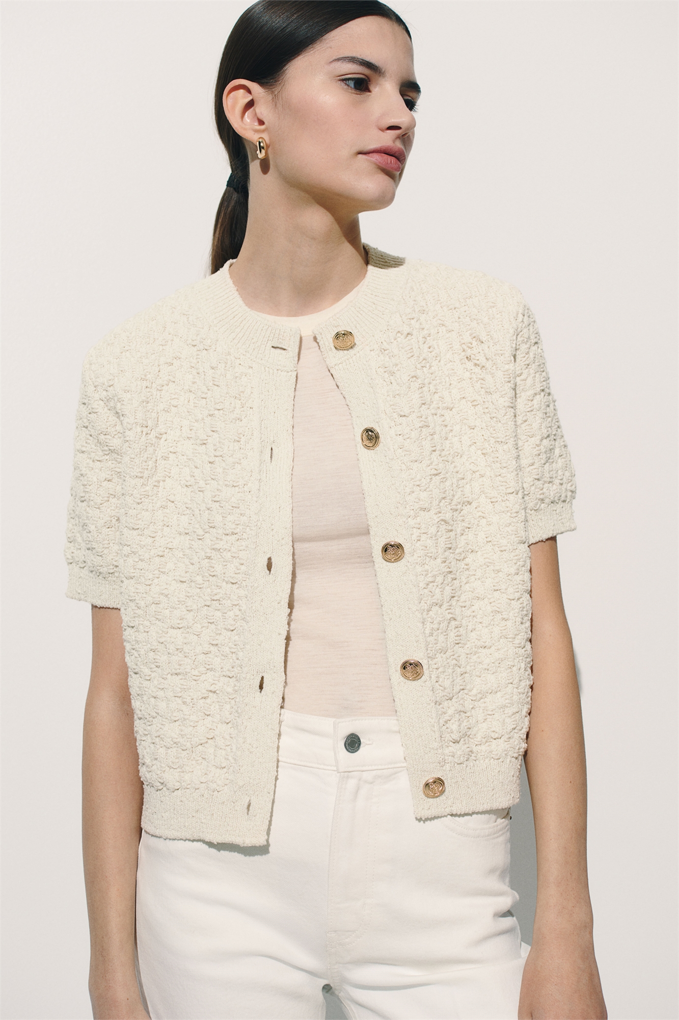 Кардиган с короткими рукавами из фактурного трикотажа с металлическими пуговицами с узором спереди. Окантовка по вырезу горловины, манжетам и подолу.