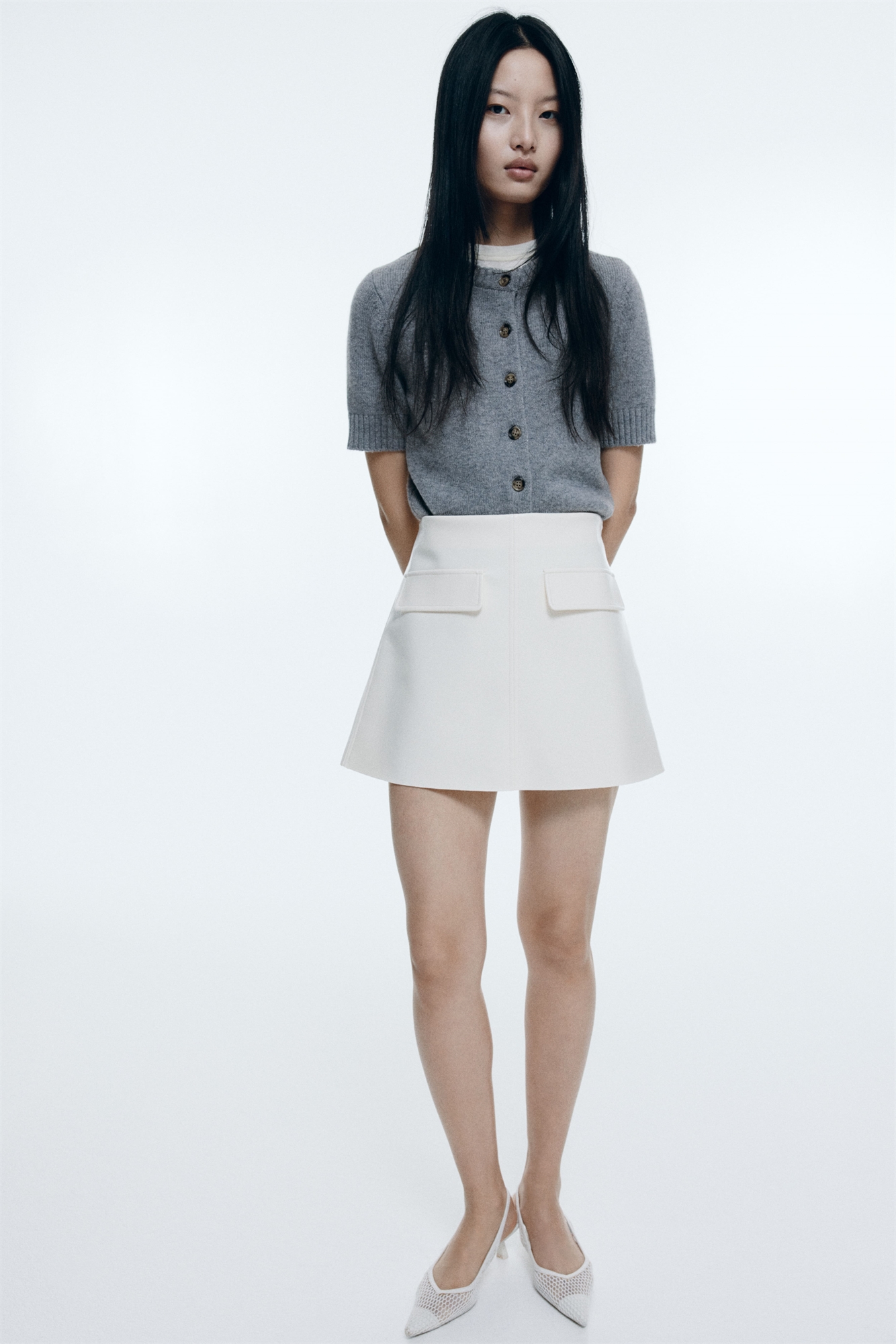 Приталенный кардиган из мягкой вязаной шерсти с круглым вырезом и пуговицами спереди. Короткие рукава и окантовка вокруг выреза, на манжетах и подоле.