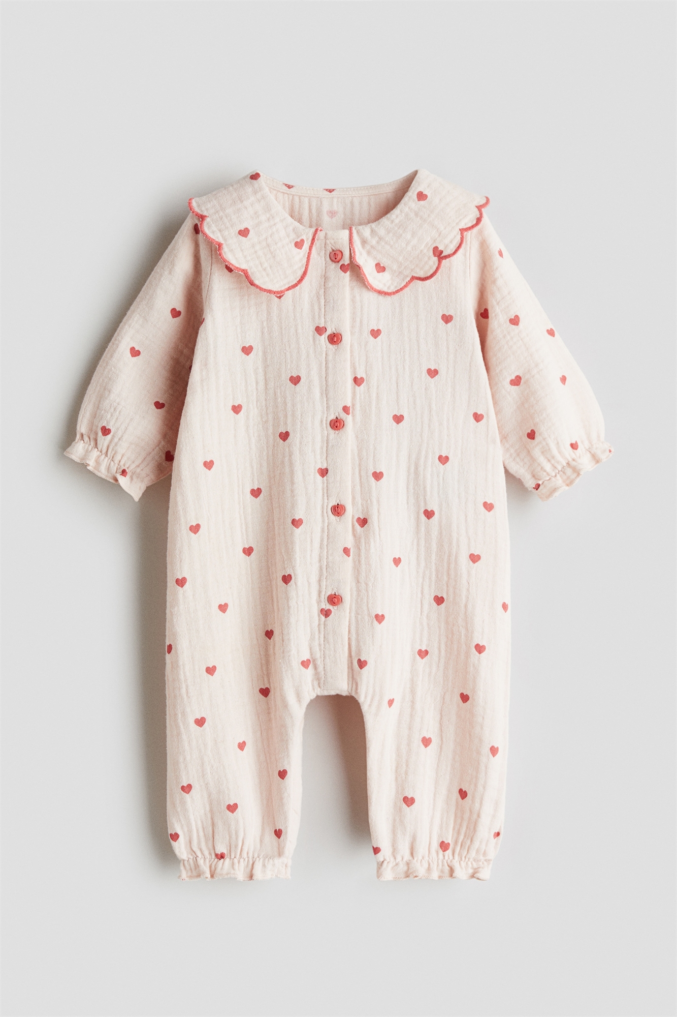 Ромпер из мягкого хлопкового муслина с принтом по всей поверхности. Круглый вырез, отложной воротник с отделкой оверлоком, пуговицы спереди и узкая резинка с оборками на манжетах и подол.