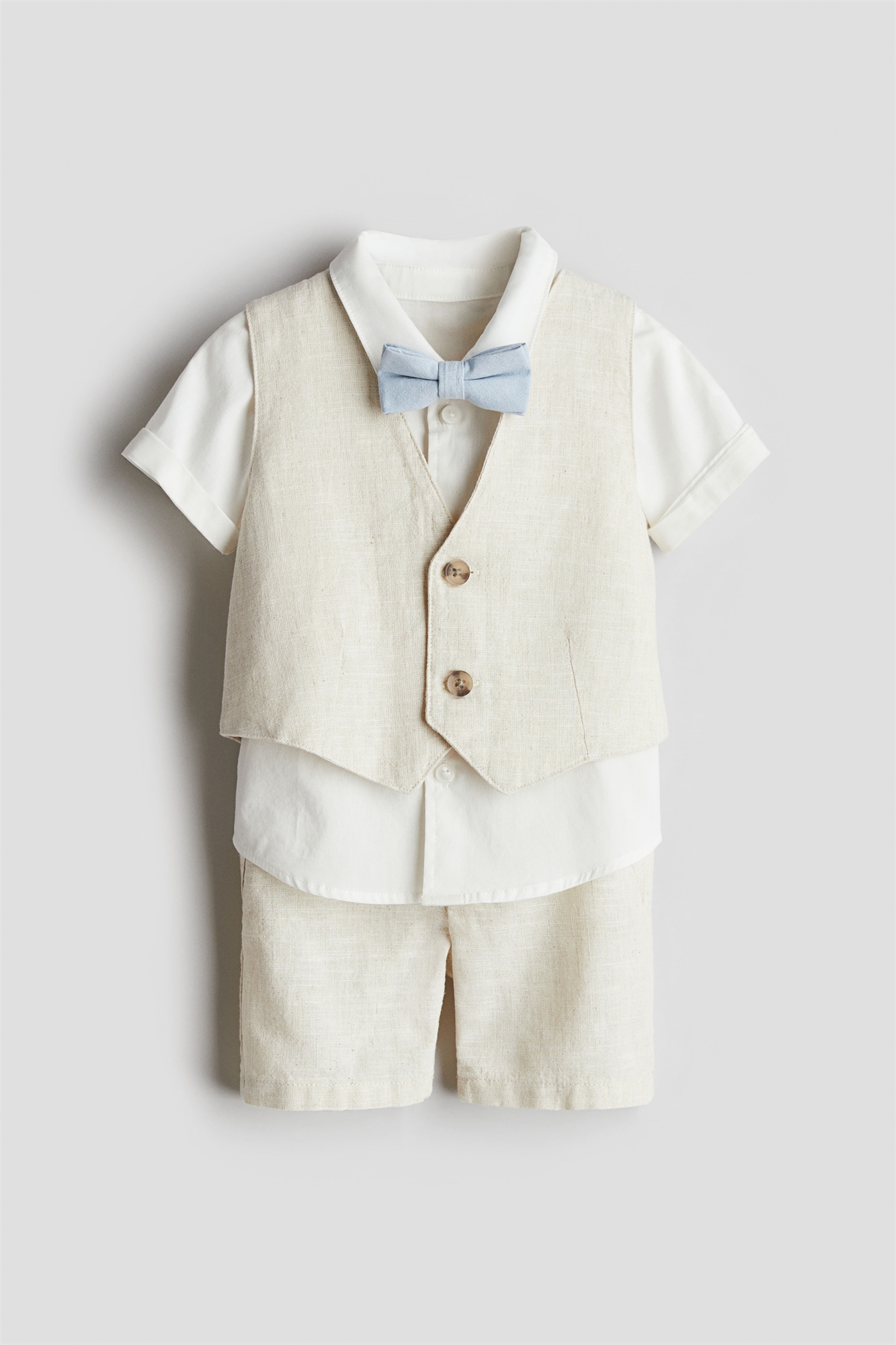Нарядный комплект, состоящий из пальто с поясом и пары шорт из мягкой льняной ткани, рубашки из хлопкового поплина и галстука-бабочки. Пальто на талии с пуговицами спереди. Шорты с регулируемым эластичным поясом, фальшивой ширинкой с пуговицей и декоративными карманами спереди и сзади. Галстук-бабочка с регулируемым эластичным ремешком и пластиковой застежкой сзади.