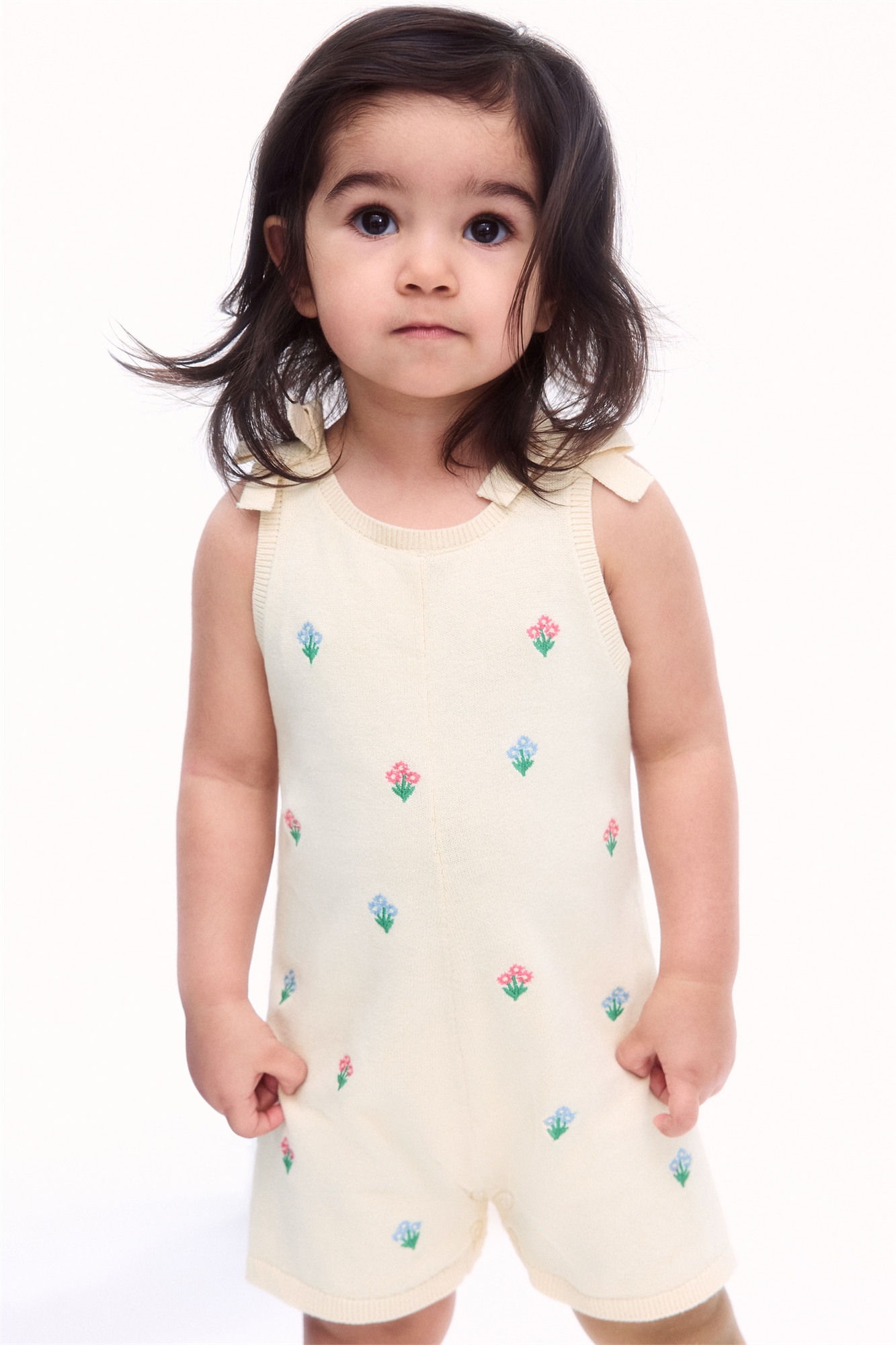 Ромпер из мягкого хлопка тонкой вязки с небольшими вышитыми деталями спереди. Круглый вырез с ребристой отделкой, бретели с декоративными завязками и прорезь для ключа с кнопкой сзади. Кнопки внизу для удобства переодевания и тесемки по проймам и подолу.