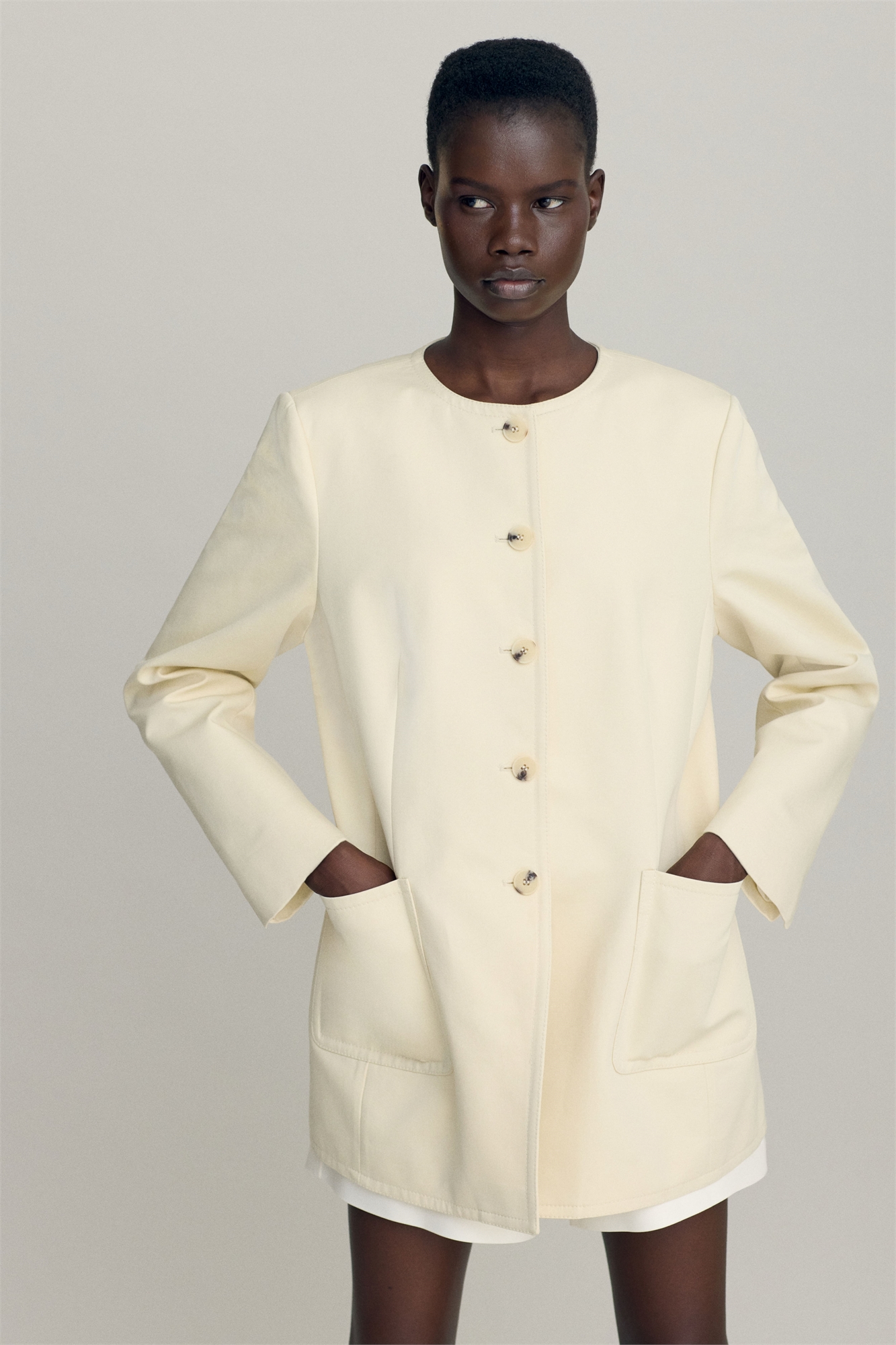 Приталенный жакет из тканого материала с круглым вырезом и пуговицами до талии. Накладные карманы спереди и формирующие вытачки на талии для создания облегающего силуэта. Накладки на плечах и рукава с разрезом на манжетах. На подкладке.