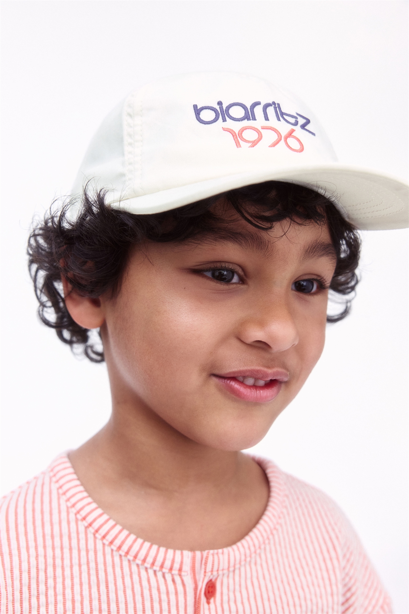 Кепка из хлопковой саржи с вышитыми мотивами спереди и сзади, а также вышитыми люверсами на макушке. Регулируемый язычок с металлической застежкой сзади. Хлопковый потник.