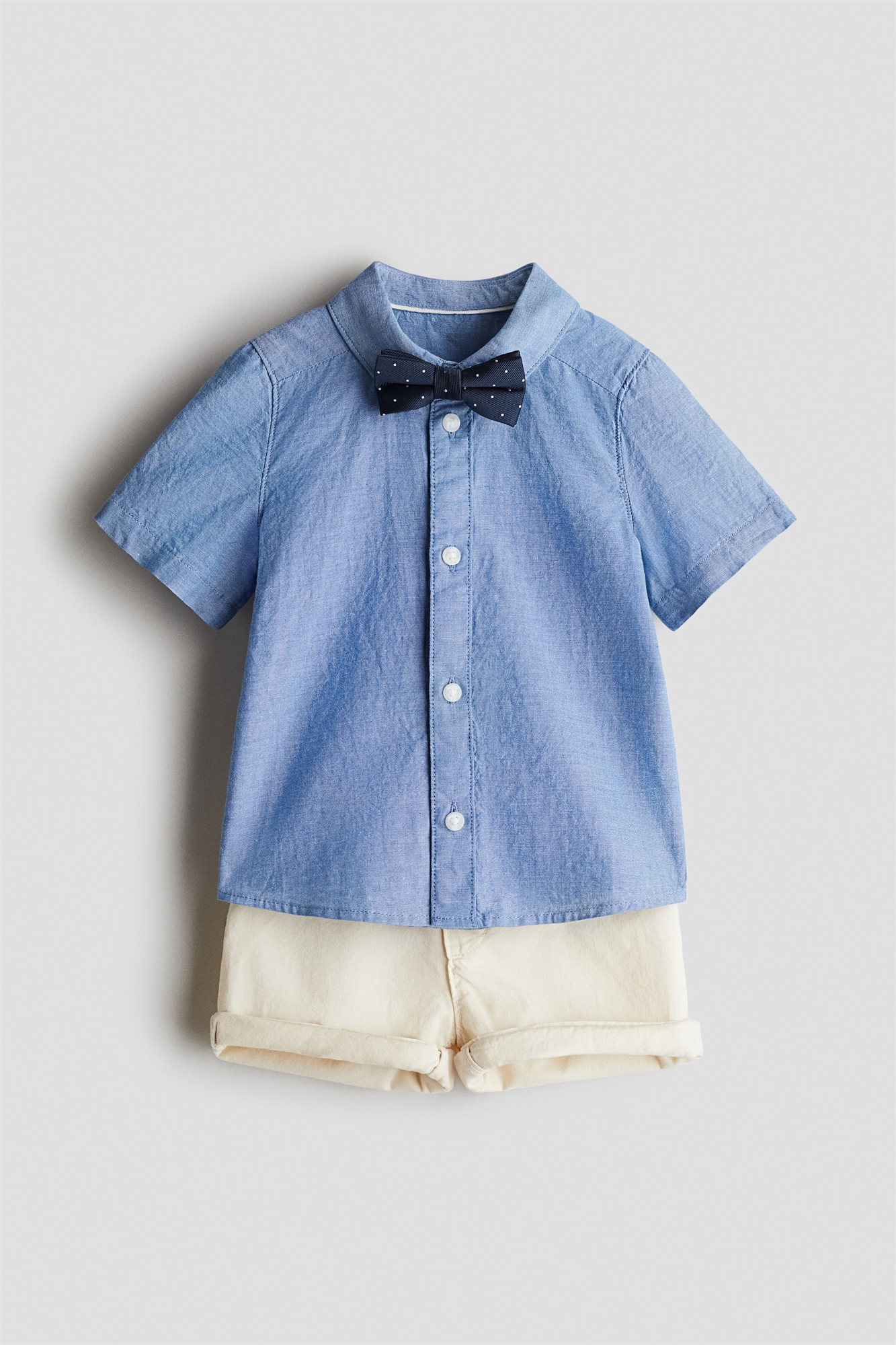 Хлопковый комплект, состоящий из рубашки мягкого плетения, пары шорт из мягкой саржи и подходящего галстука-бабочки. Рубашка с короткими рукавами, отложным воротником на пуговицах и пуговицами спереди. Шорты с регулируемым эластичным поясом, застежкой на молнию с пуговицей и декоративными передними карманами. Галстук-бабочка с регулируемым эластичным ремешком и пластиковой застежкой сзади.