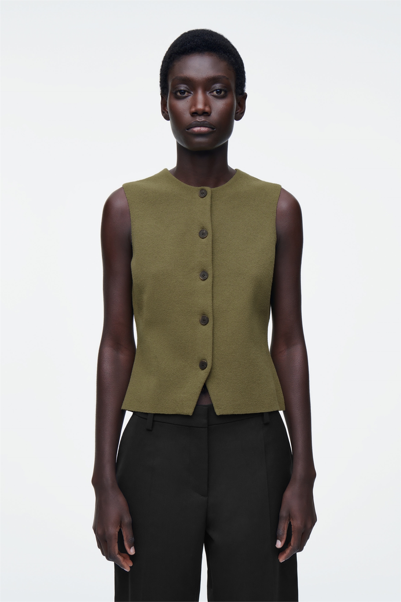 Коллекция одежды COS - это чистые линии и сдержанная простота. Эта трикотажная хлопковая жилетка насыщенного оливкового оттенка с вырезом горловины и V-образным разрезом на подоле. Носите его с джинсами или брюками. Регулярный крой Застежка на пуговицы Переработанный нейлон (полиамид) снижает потребность в ограниченных природных ресурсах и сокращает выбросы парниковых газов Состав: 60% хлопок, 39% переработанный полиамид (переработанный нейлон), 1% переработанный эластан. Без учета отделки / Машинная стирка Длина по спинке для размера S составляет 54 см / Модель носит размер S