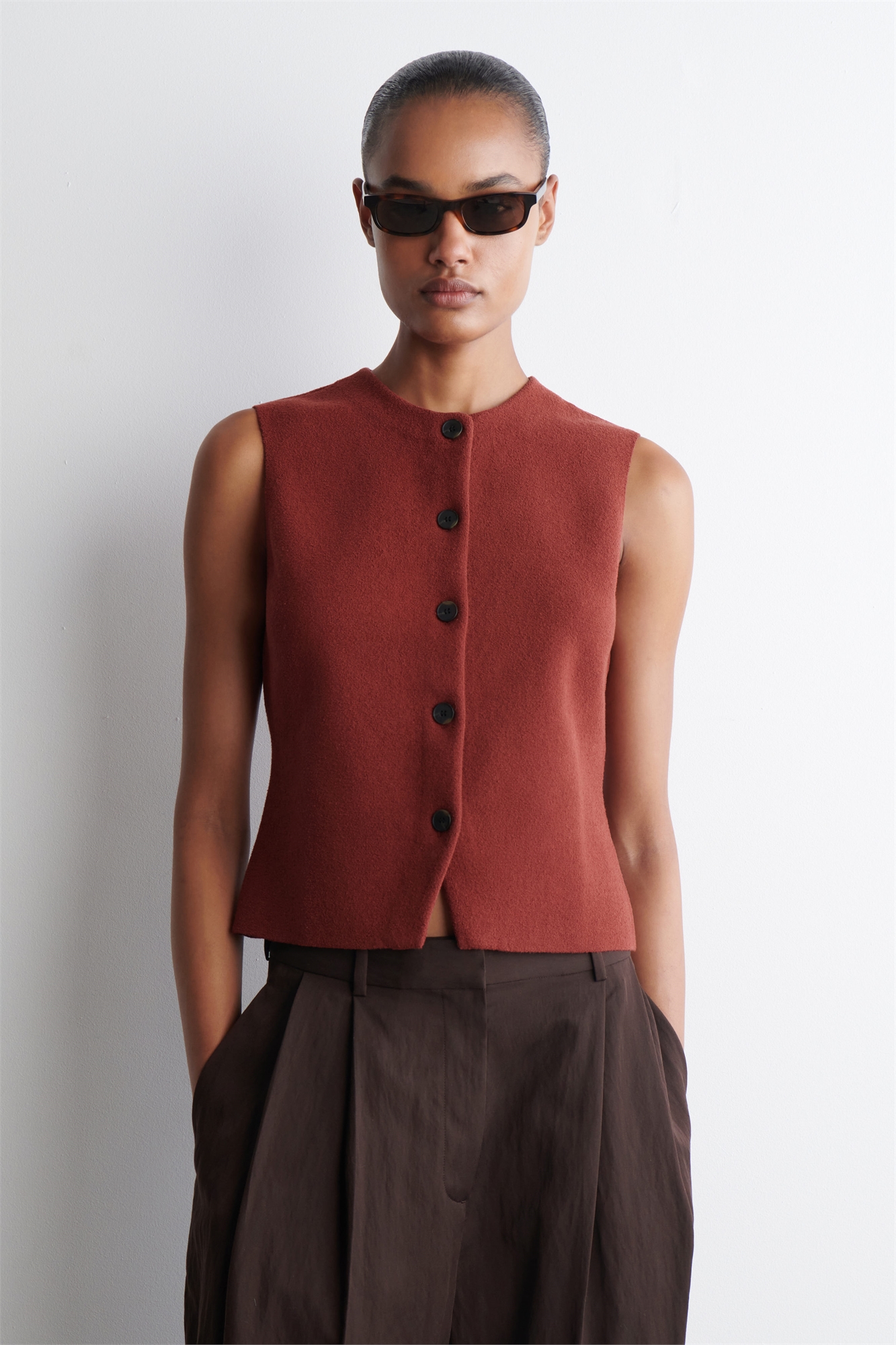 Коллекция одежды COS - это чистые линии и сдержанная простота. Эта трикотажная хлопковая жилетка насыщенного оливкового оттенка с вырезом горловины и V-образным разрезом на подоле. Носите его с джинсами или брюками. Регулярный крой Застежка на пуговицы Переработанный нейлон (полиамид) снижает потребность в ограниченных природных ресурсах и сокращает выбросы парниковых газов Состав: 60% хлопок, 39% переработанный полиамид (переработанный нейлон), 1% переработанный эластан. Без учета отделки / Машинная стирка Длина по спинке для размера S составляет 54 см / Модель носит размер S