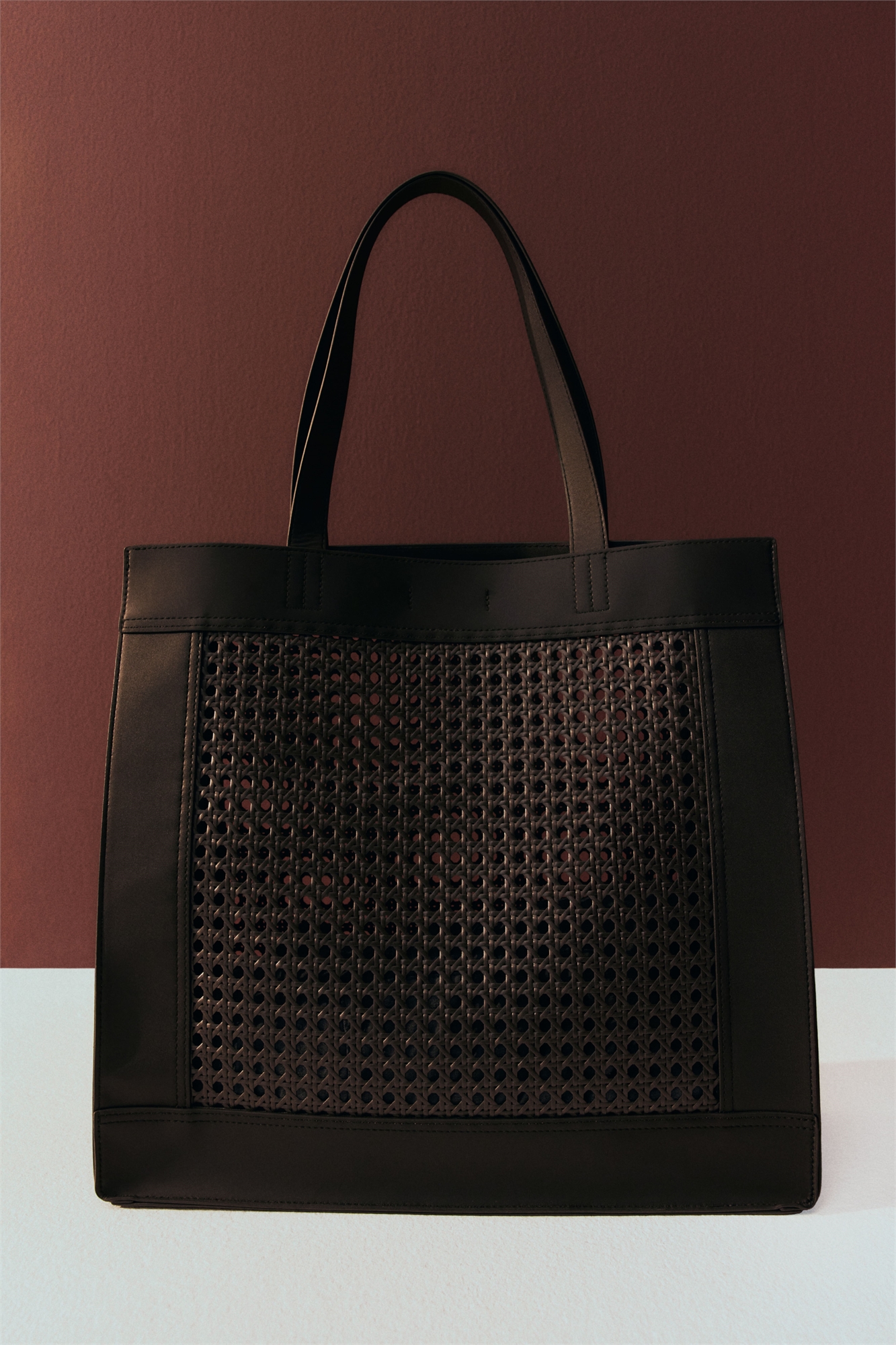 Сумка-шоппер из мелованной ткани с двумя ручками и ротанговой панелью спереди и сзади. С каждой стороны имеются застежки для регулировки формы сумки.