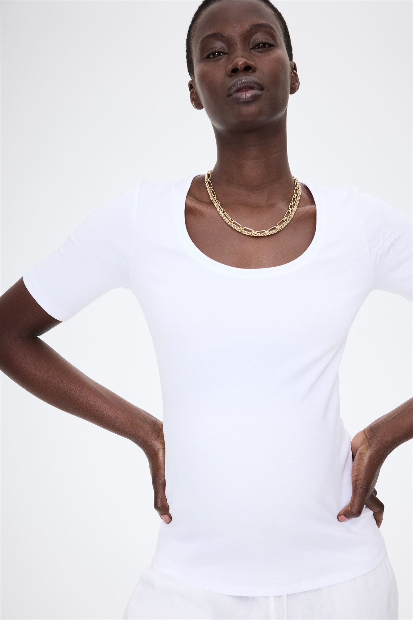 Облегающий топ из мягкого хлопкового джерси с вырезом-лодочкой и короткими рукавами.