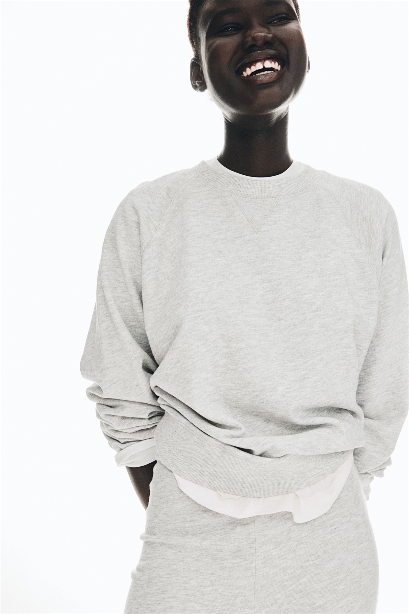 Топ из легкой толстовочной ткани с горловиной, классической V-образной вставкой и длинными рукавами реглан. Окантовка по вырезу горловины, манжетам и подолу.
