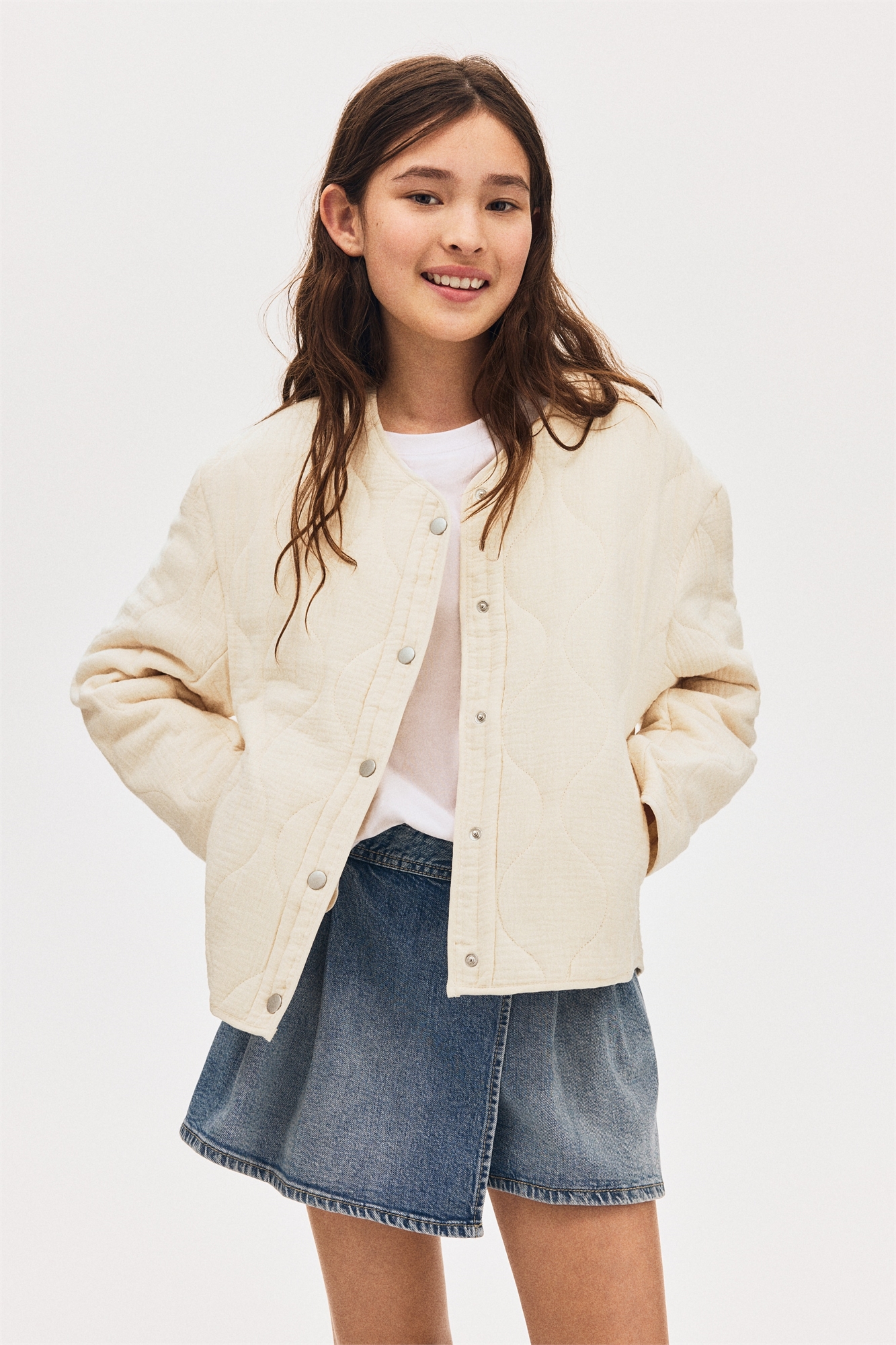 Куртка с легкой подкладкой из мягкого стеганого хлопкового муслина. V-образный вырез, застежки на кнопки спереди, прорезные боковые карманы и обвязка по пройме, манжетам и подолу. Хлопковая подкладка.